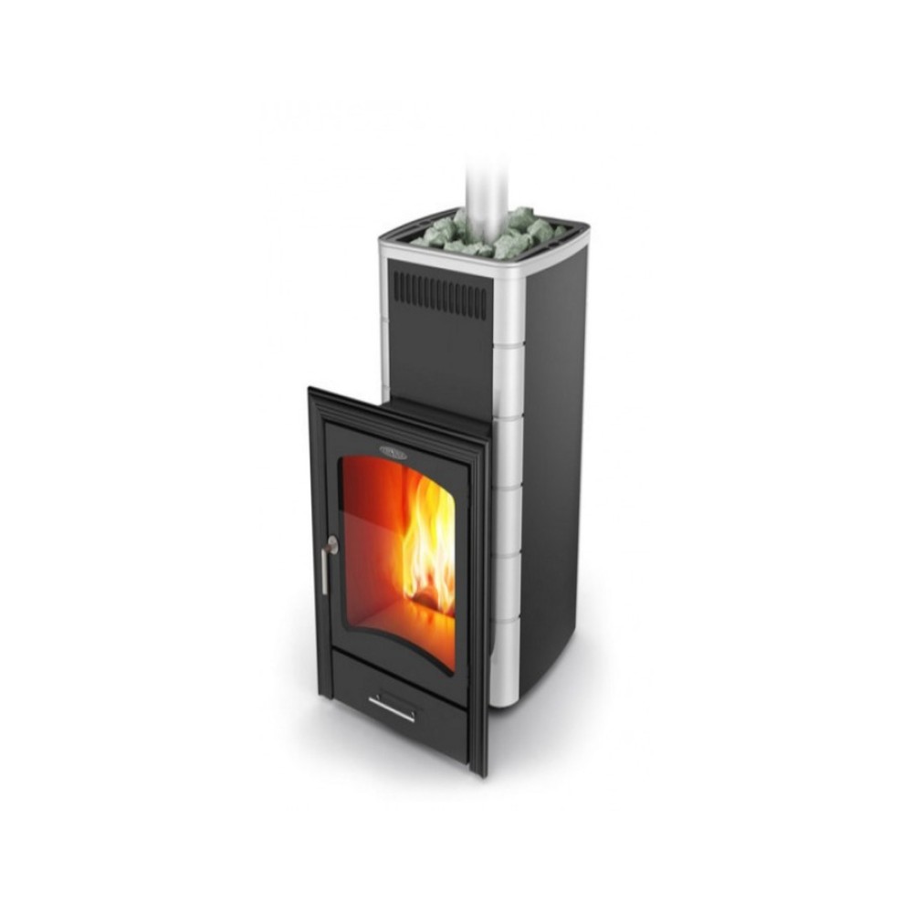 Она сочетает в себе мощную банную печь и большой красивый камин. Лабиринтный газоход обеспечивает мощный скоростной нагрев парилки объемом до 30 м3 и качественный прогрев каменной закладки массой около 100 кг.