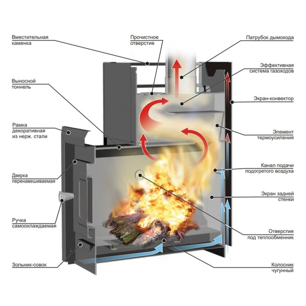 - Выносной нерегулируемый топочный канал позволяет производить закладку дров из смежного помещения.
