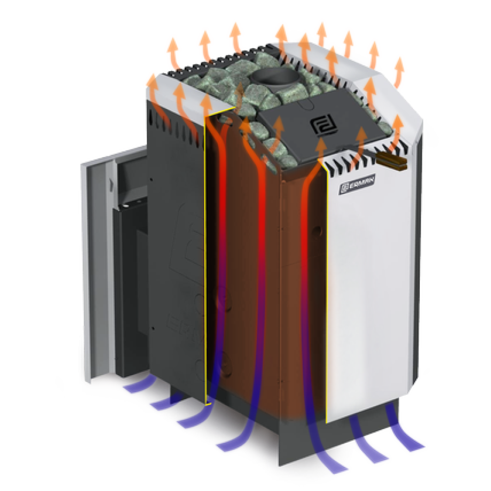 - Максимальный КПД, благодаря уникальной конструкции топки и сложной двухпоточной системе дымовых каналов с камерой распределения огня под каменкой