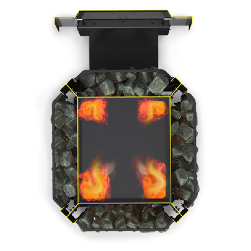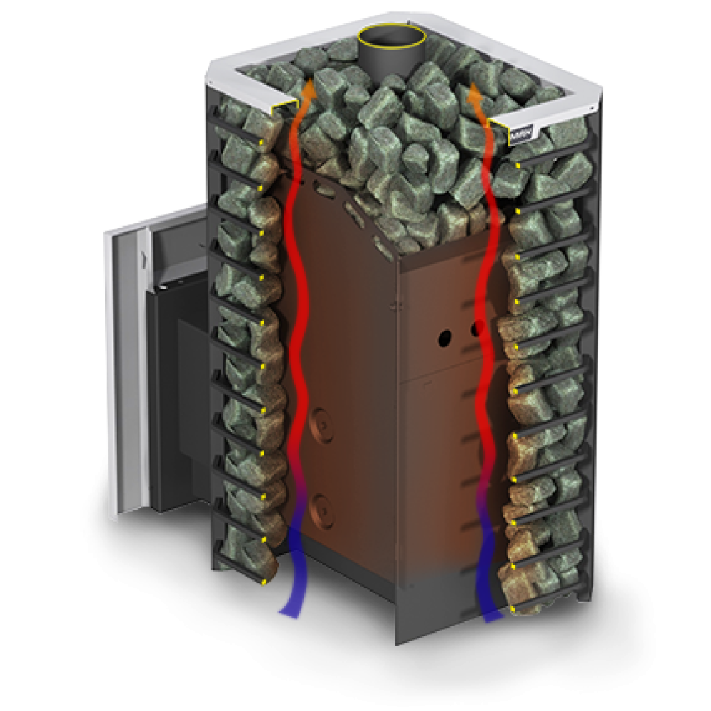 - Максимальный КПД, благодаря уникальной конструкции топки и сложной двухпоточной системе дымовых каналов с камерой распределения огня под каменкой