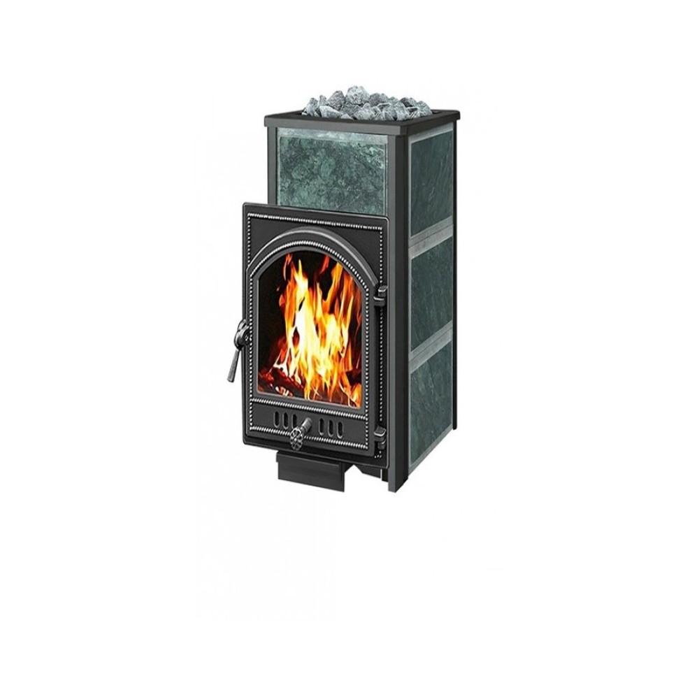Преимущество печи в том, что топка печи состоит из 3-х ЧУГУННЫХ элементов. На стыке между ними используется керамический шнур с рабочей температурой 1200 градусов. То есть топка печи абсолютно герметична! Для фиксации деталей между собой применяется болтовое соединение, что даёт 100% гарантию безопасности при эксплуатации. Конвекционно–вентилируемая облицовка, изготовленная из экологически чистой горной породы , который обладает большой теплоёмкостью, что позволяет камню в короткие сроки нагреваться и максимально долго удерживать стабильную температуру в парильном помещении, а также гасить жёсткое инфракрасное излучение Камень обладает исключительными лечебными свойствами: помогает при головных болях, при нестабильном артериальном давлении, при простудных заболеваниях, воспалительных процессах в почках и пищеварительной системе, снимает повышенную возбудимость и нервозность, сглаживает эмоциональные всплески. Облицовка из натурального камня при нагреве способна аккумулировать тепло, что гарантирует максимально равномерный прогрев и сохранение тепла Банная печь ЛЕГЕНДА 28 (205) укомплектован чугунной каминной, самоохлаждаемой дверцей Везувий 205 с большим жаропрочным стеклом «SCHOTT ROBAX», с оборудованной системой самоочистки, что позволяет визуально контролировать горение и любоваться видом живого огня. Данная печь рассчитана на объем парильного помещения 14-30 м3.