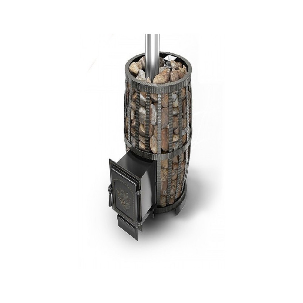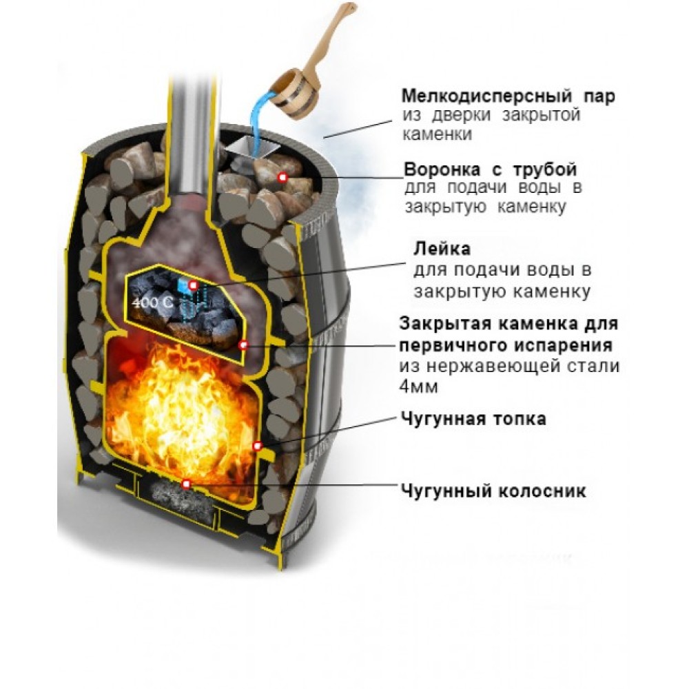 Вода подается в самую горячую центральную часть закрытой каменки через воронку (при этом дверь закрытой каменки должна быть приоткрыта для поступления мелкодисперсного пара в парное отделение). Все элементы топки отлиты из чугуна и соединены между собой с помощью болтового соединения через термостойкий шнур и герметик, а закрытая каменка изготовлена из жаростойкой высоколегированной 4 мм нержавеющей стали.