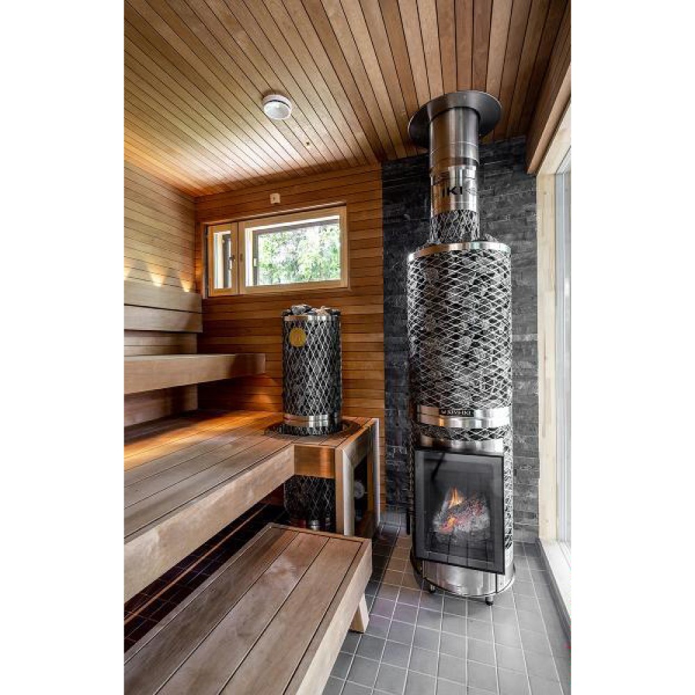 IKI (Ики) KIVI (дверца открывается направо) – это большая дровяная печь с сетчатым корпусом, предусматривающая установку в просторной парилке. Топка и основные стенки отопительного агрегата изготовлены из толстолистовой стали, которая быстро передает тепло камням. Камни, в свою очередь нагревают стальную решетку, и таким образом достигается невероятно высокая тепловая производительность данной печи. Стеклянная дверца позволяет людям наблюдать за огнем, что способствует большему расслаблению и отдыху.
