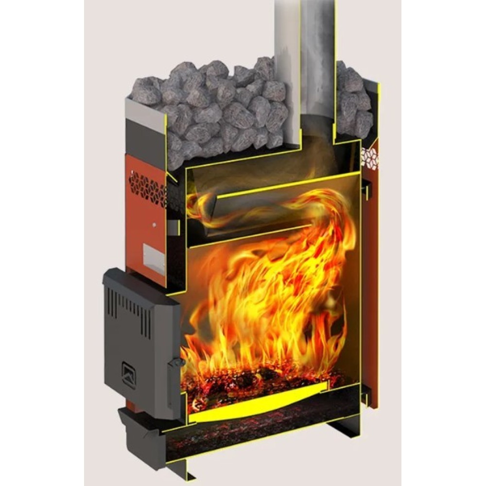 Уникальная конструкция позволяет нагревать воздух в парной не пересушивая его и получать много пара с большой каменки.