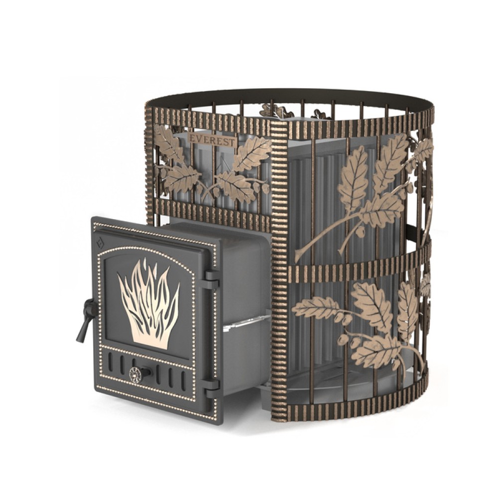 Печь Эверест Ковка 24 (281) предназначена для нагрева воздуха и получения влажного пара в русской бане или сухого пара в финской бане в парных помещениях объемом от 15 до 25 м3. К основанию печи крепятся фасонные стальные детали, образующие поверхность для укладки камней. Сетка предназначена для обустройства открытой каменки, повышения теплоёмкости печи, выравнивания скорости нагрева парной.