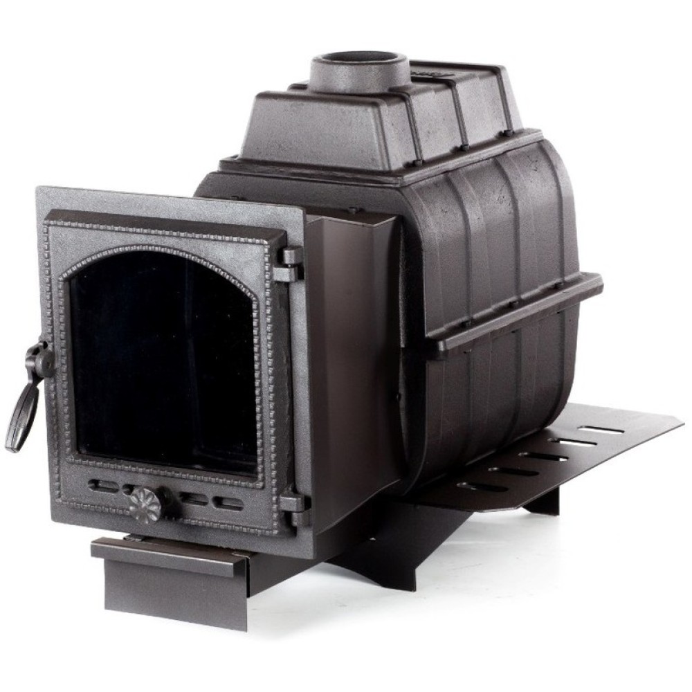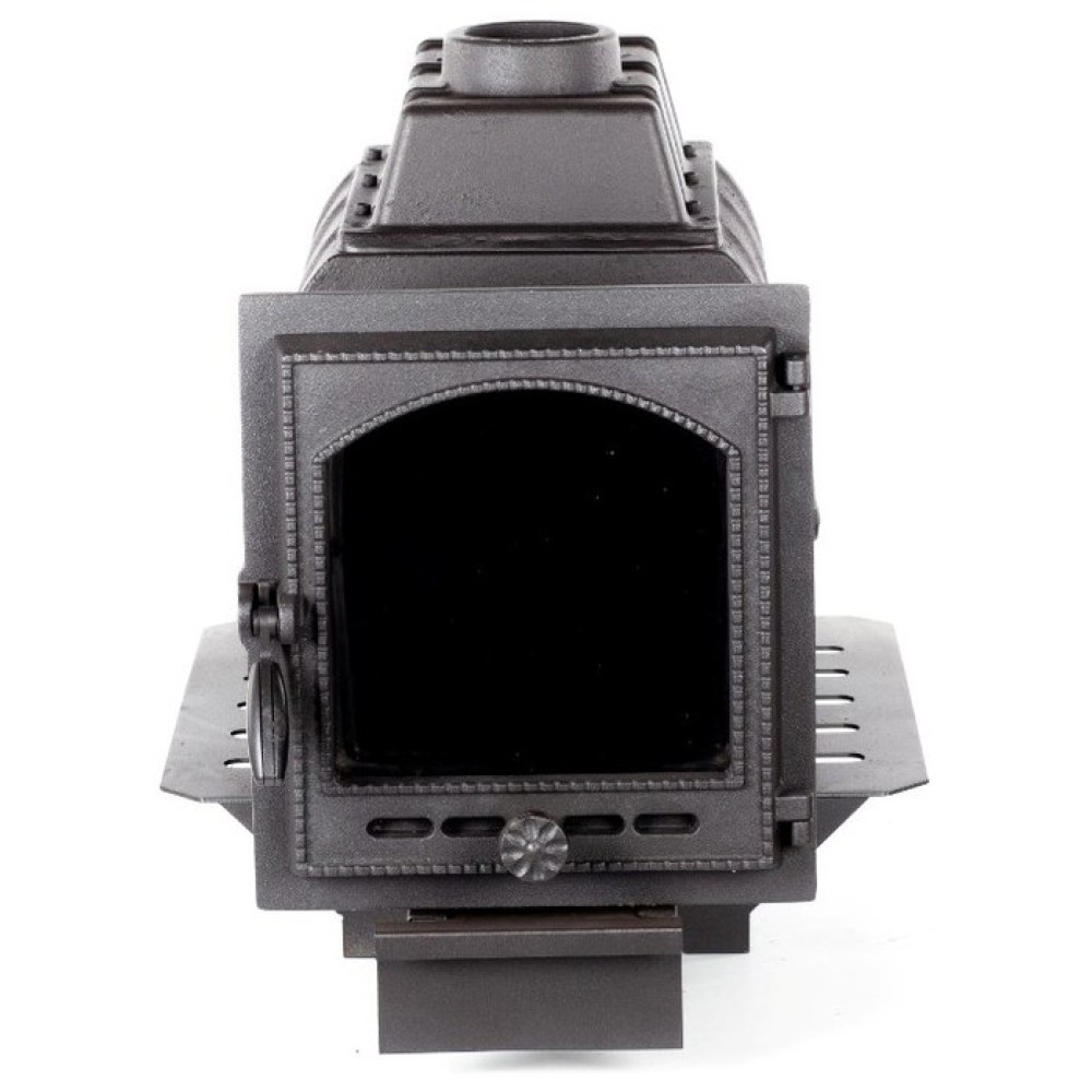 - Чугунная дверца с термостойким стеклом обдувается воздухом (создана воздушная завеса), не подвержена оседанию копоти, обзор со временем не теряется;
