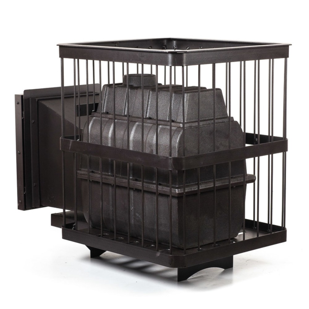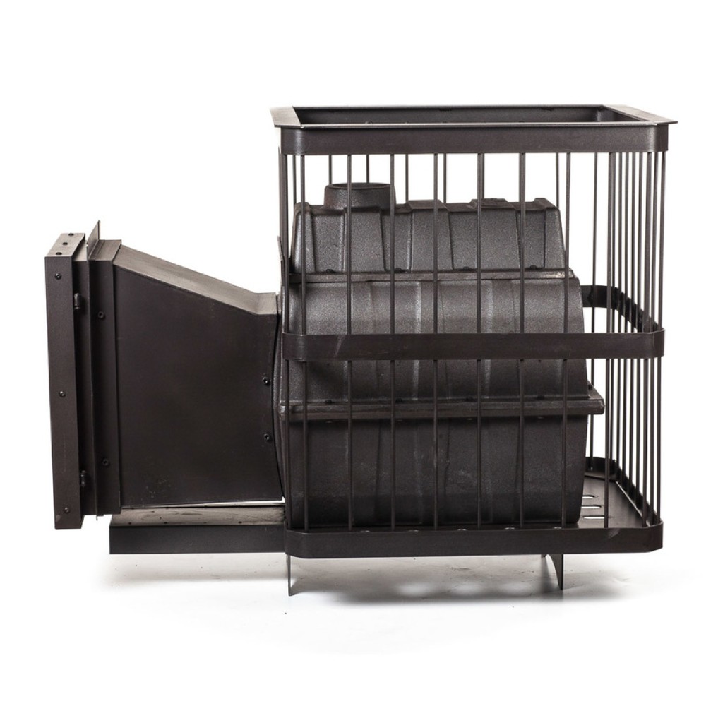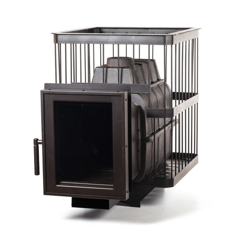 - Вместительная каменка, изготовленная из стального прута и дополнительно усиленная по центру ребрами жесткости, является мощным парогенератором;