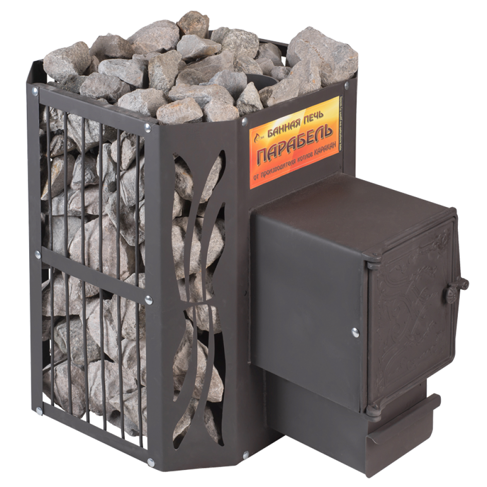 Наличие выносного предтопочного тоннеля предусматривает установку печи в парилке, с выходом топки в смежное помещение. Топочная дверца - с конструктивной возможностью перенавески. Топка печи изготавливается из стального листа толщиной 6 мм. Каменка вмещает большой объем теплоаккумулирующих элементов. Разборная конструкция ограждающего кожуха существенно облегчает транспортировку печи.