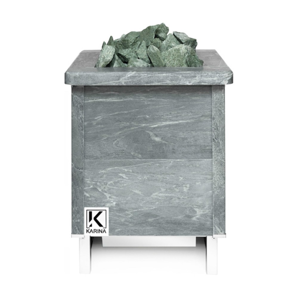 Банные печи Karina QUADRO выполнены в прямоугольной форме, где ТЭНы находятся внутри корпуса и нагревают группу камней. Для нормальной деятельности каменки требуется естественный приток воздуха. Печь работает на источнике с электрическим питанием 220 или 380 В. Корпус печей снаружи состоит из плит талькохлорита или змеевика, а основа изготавливается из нержавеющей стали.