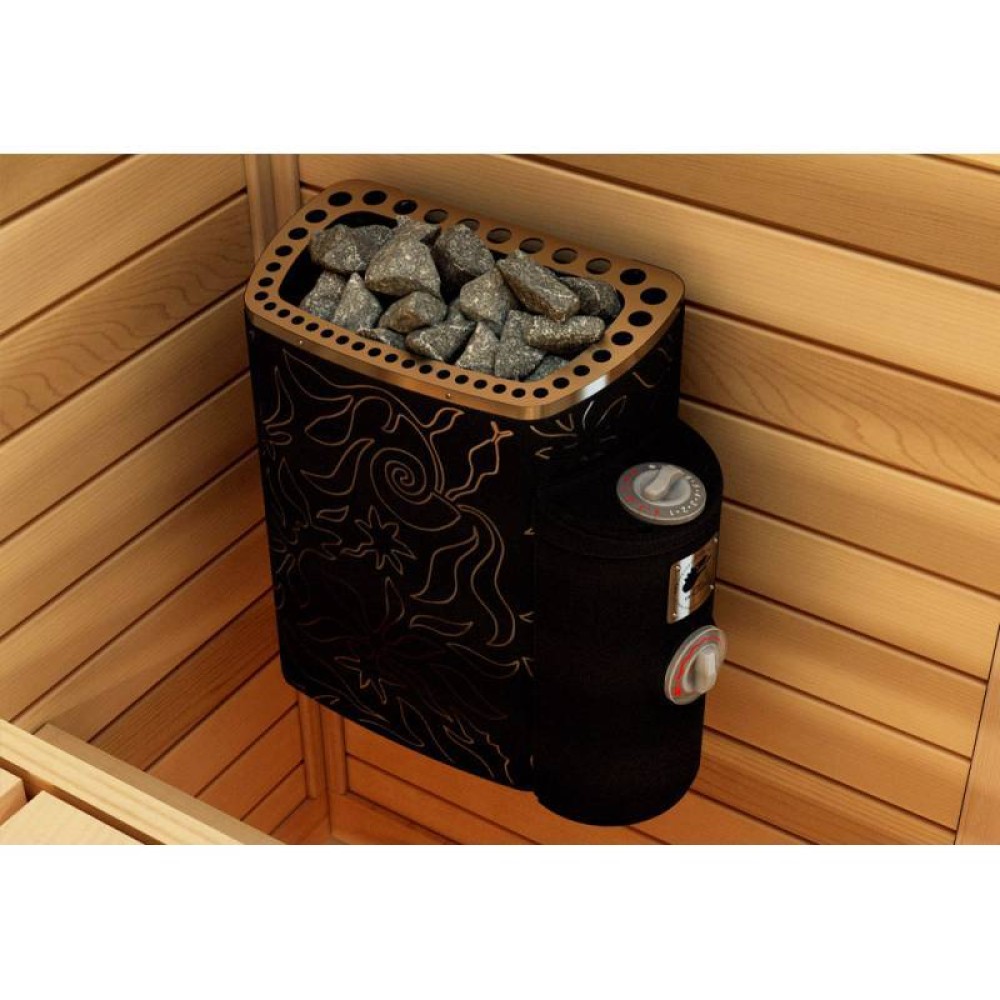 Стильный дизайн с выбитым рисунком на корпусе хорошо впишется как в семейную сауну, так и частную
