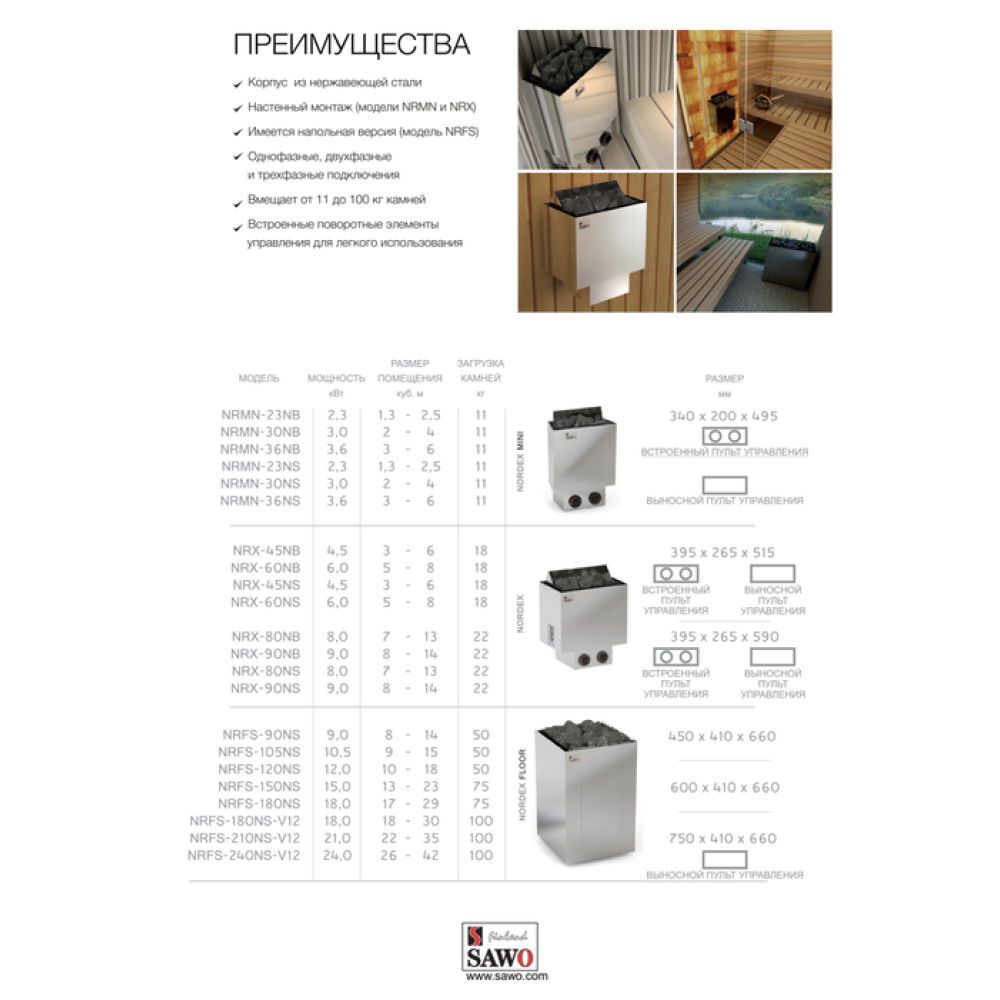 В ассортимент серии электрических печей SAWO Nordex входят настенные и напольные модели из нержавеющей стали. В зависимости от модификации печи функции управления доступны через встроенную или внешнюю панель управления. В рассматриваемой серии вы найдете подходящую печь в диапазоне мощности - от 2,3 до 24 кВт для любого типа сауны. Обновленная линейка печей с выносным пультом получила еще и некоторую модификацию корпуса. Минимализм и простота форм, присущие дизайну линии Nordex, не умоляют технического совершенства ее моделей.