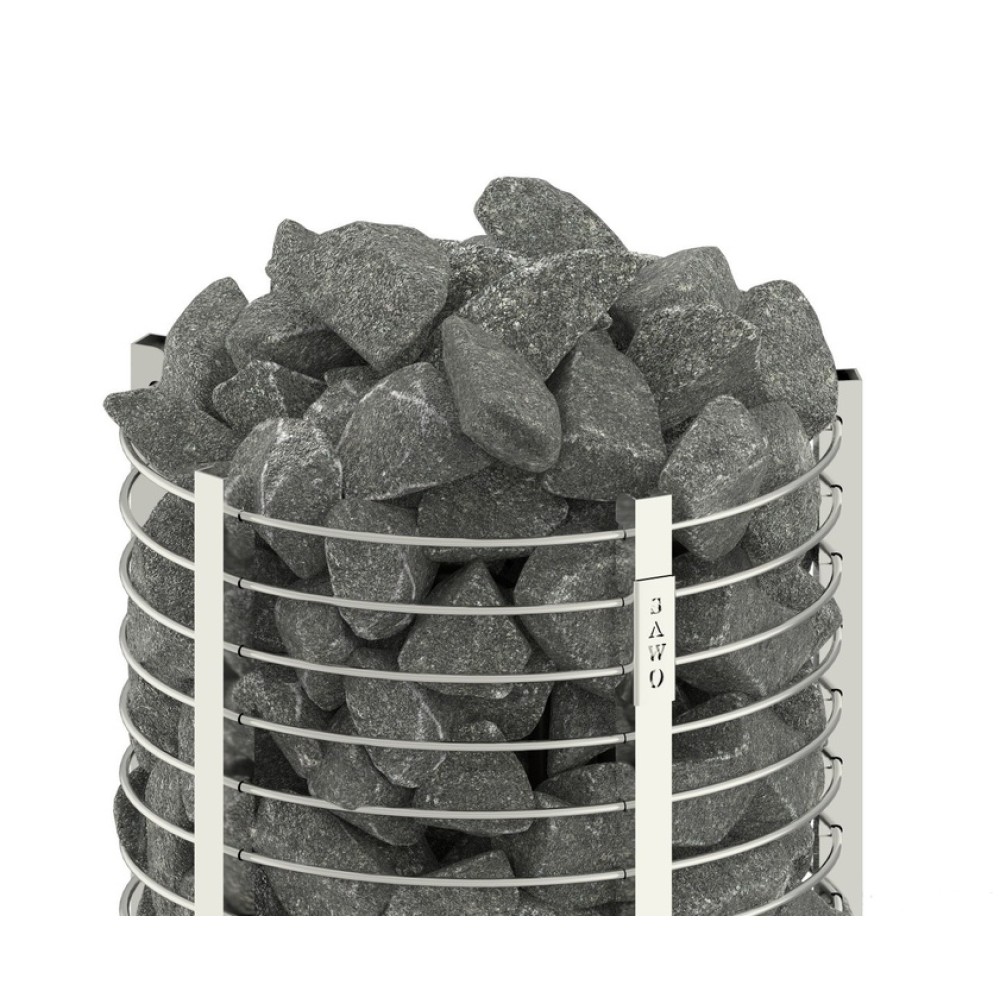 Электрические печи SAWO серии TOWER имеют необычный дизайн, который разработан для заполнения паром всей сауны от пола до самого потолка. Впечатляющий массив камней удерживают крепкие кольца из нержавеющей стали, внешне напоминая каменную башню. Нагревательные ТЭНы прибора находятся по центру. В линейке есть модель цилиндрической формы а также для пристенной и угловой установки.