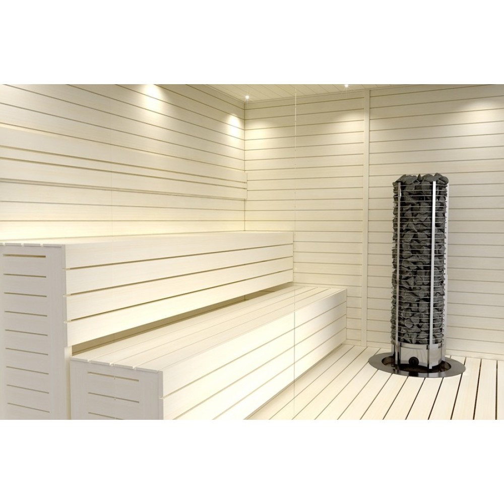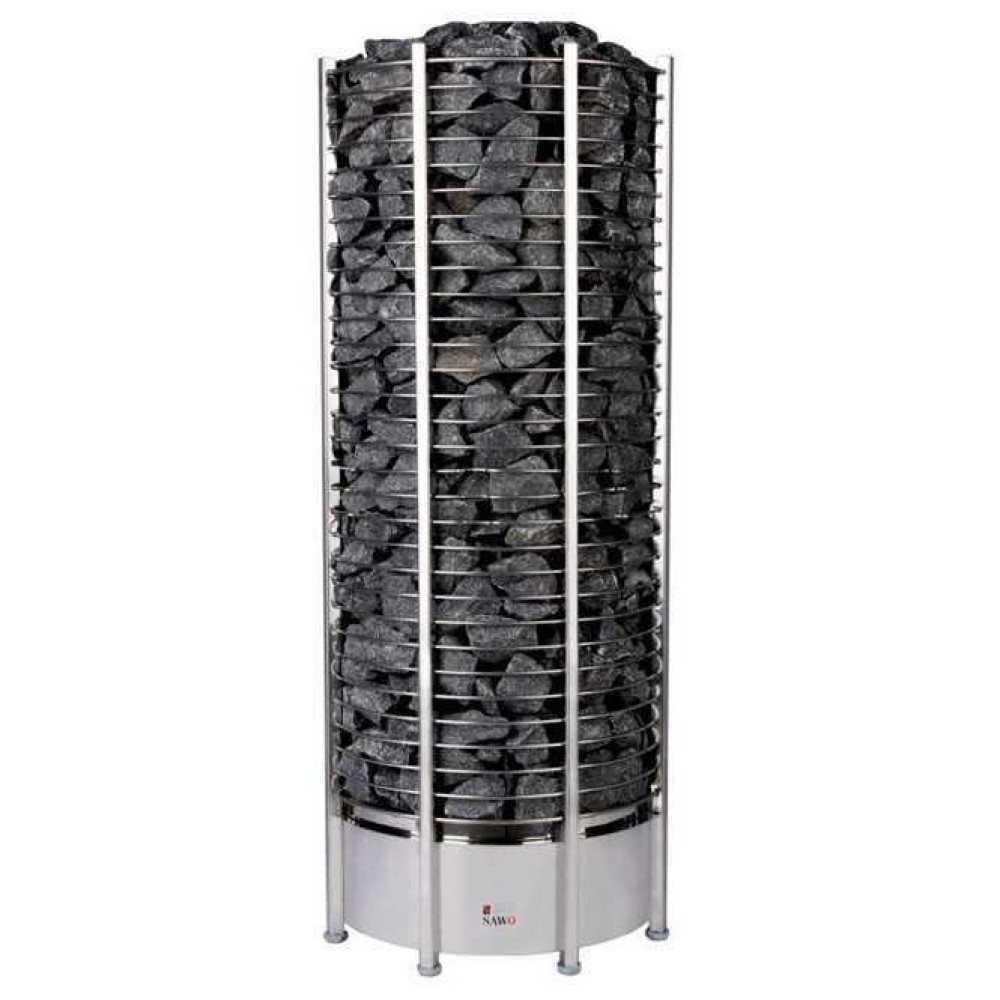 Электрические печи SAWO серии TOWER имеют необычный дизайн, который разработан для заполнения паром всей сауны от пола до самого потолка. Впечатляющий массив камней удерживают крепкие кольца из нержавеющей стали, внешне напоминая каменную башню. Нагревательные ТЭНы прибора находятся по центру. В линейке есть модель цилиндрической формы а также для пристенной и угловой установки.