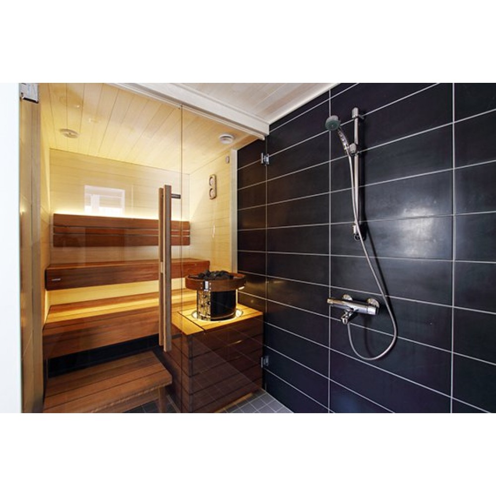 Следует отметить хорошую вместительность Harvia Cilindro PC70HE, в которую помещается 80 кг камней. Особенность конструкции - защитный кожух, частично скрывающий доступ к камням, благодаря чему с одной стороны обеспечивается возможность установки каменки в углу помещения ближе к стене, а с другой - беспроблемный доступ к камням, что позволит мягко регулировать температуру помещения, выплескивая на них воду. В представленной модели отсутствует встроенный пульт управления, который можно приобрести и установить отдельно.