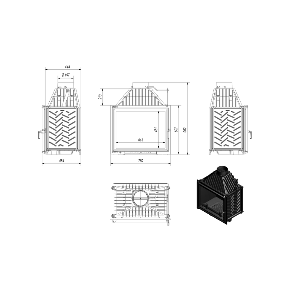 Каминная топка AMELIA/PF Kratki (Кратки) характеризует большой объем топочной камеры по сравнению с ее габаритными размерами. Имеют высокий КПД, который обеспечивают система двойного дожига и ребра по сему корпусу топки, повышающие ее тепловые характеристики.
