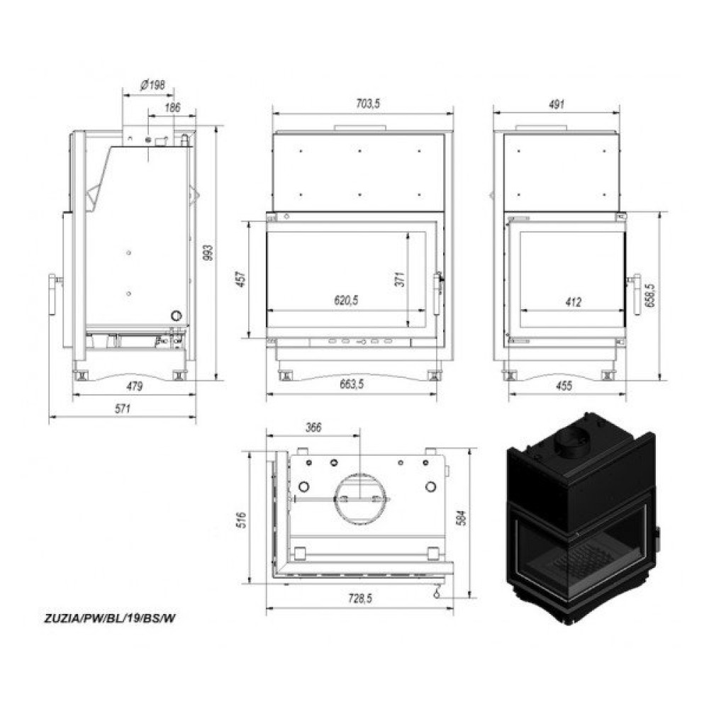 Технические характеристики Угловая левая дровяная топка Kratki ZUZIA PW/BL/19/BS/W(угловое стекло слева)