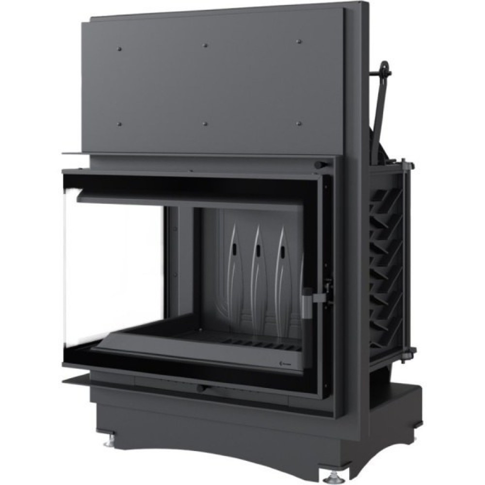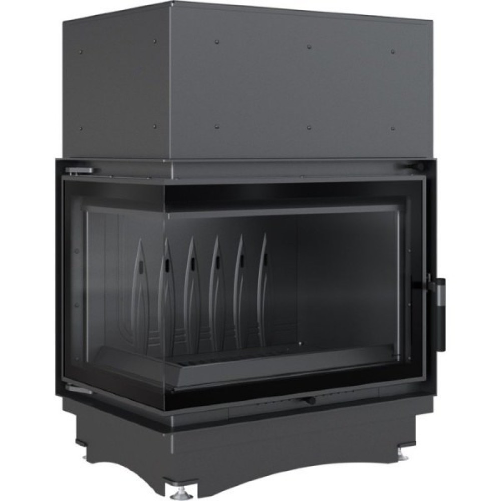 - Угловая топка с цельным Г-образным стеклом. Дверца топки распашная