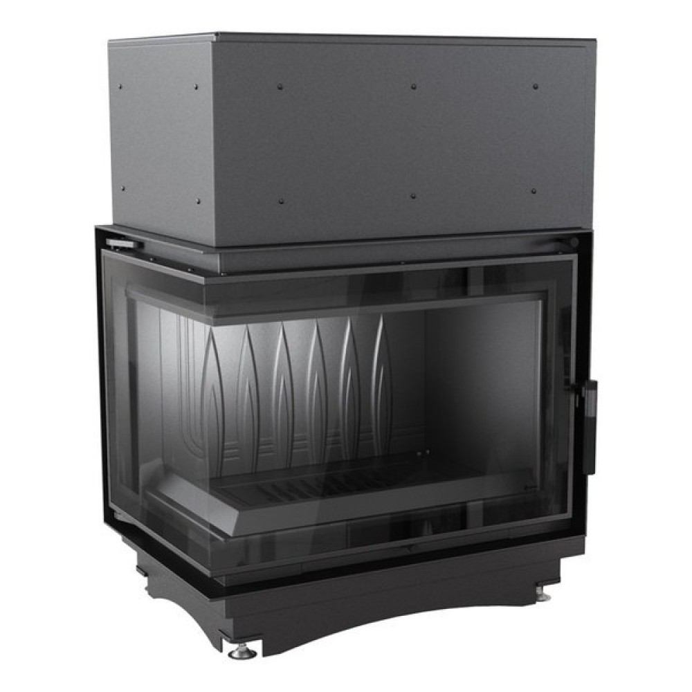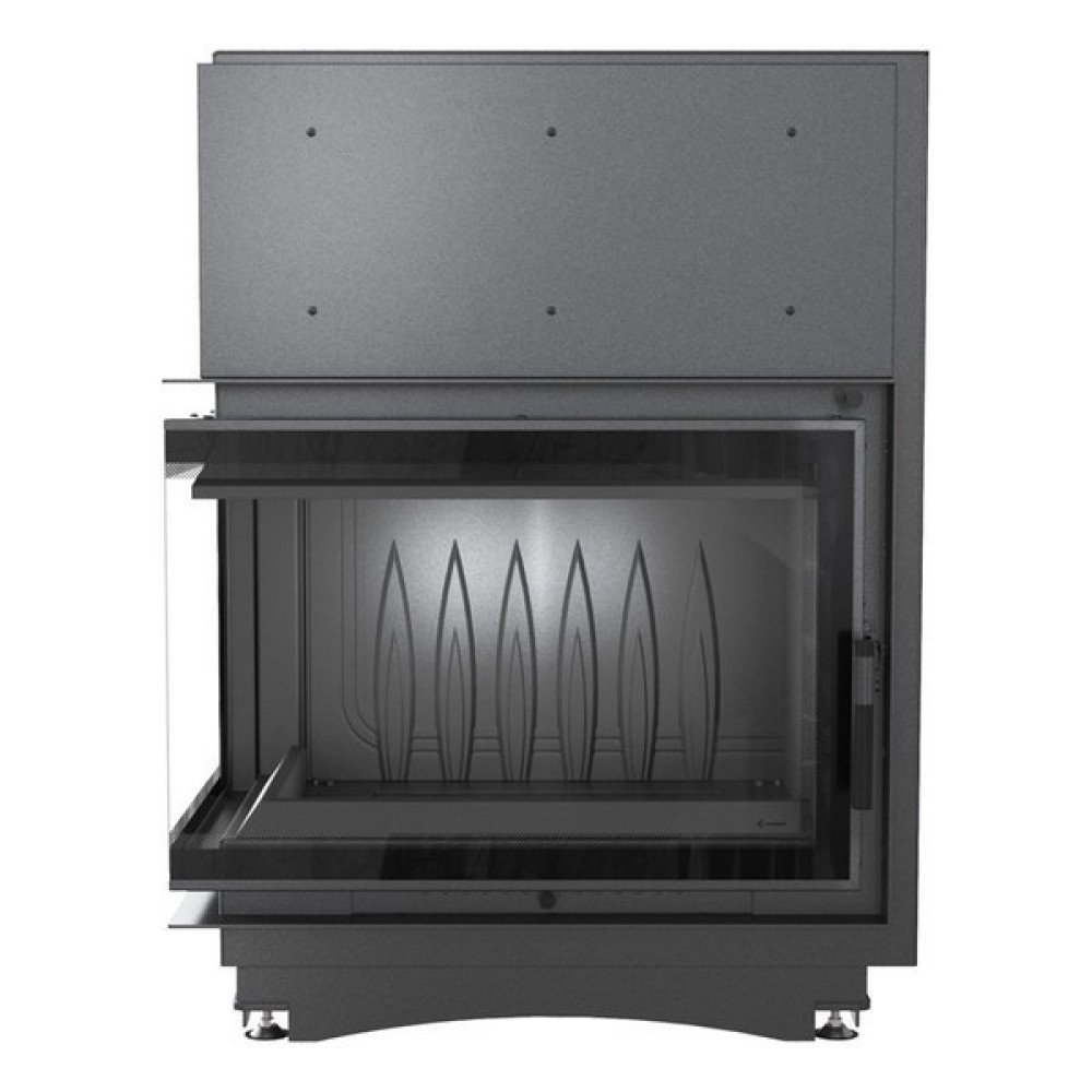 - Угловая топка с цельным Г-образным стеклом. Дверца топки распашная