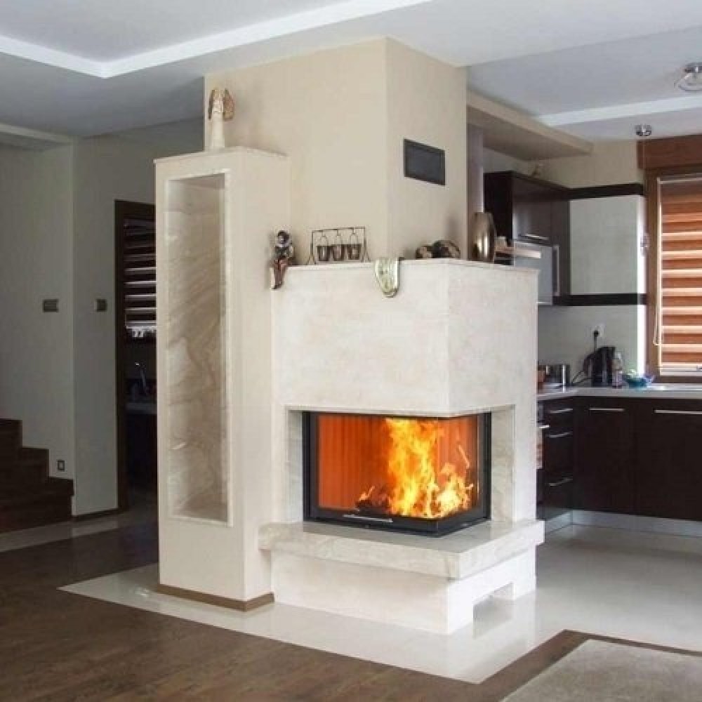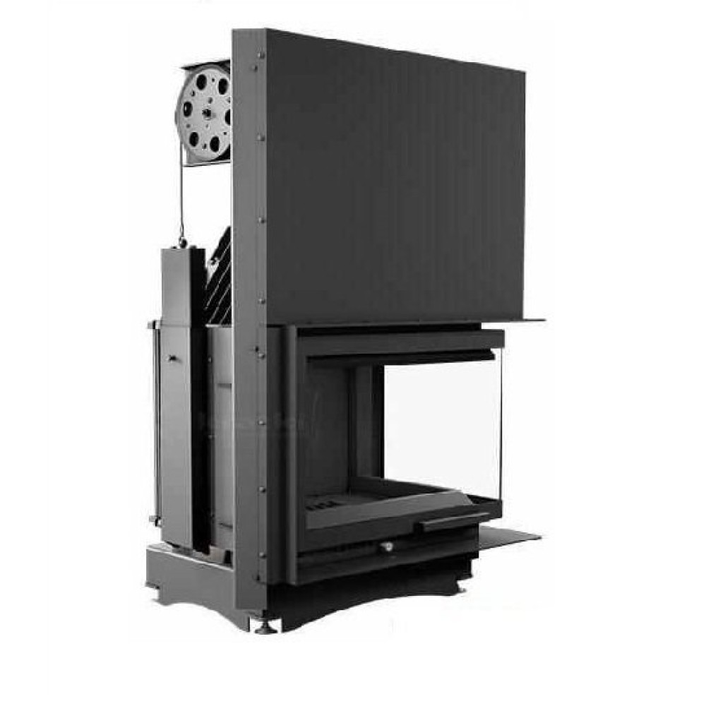 - Топка с угловой дверцей, выполненной из стекла и механизмом вертикального открытия дверцы;