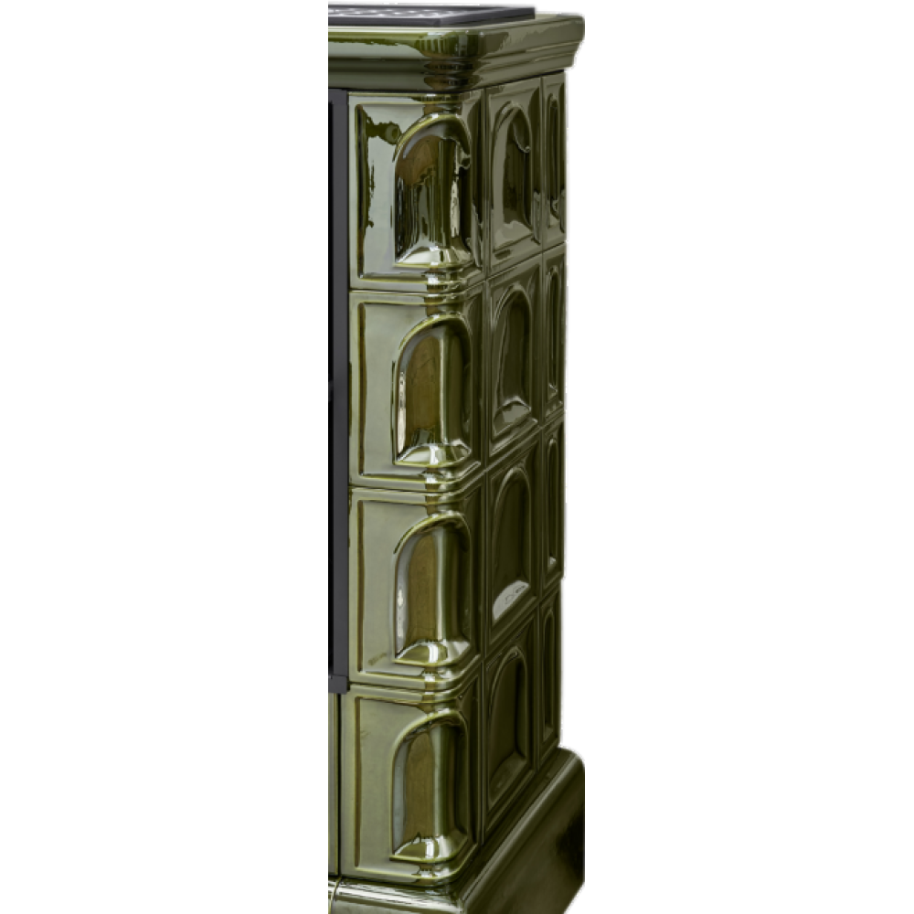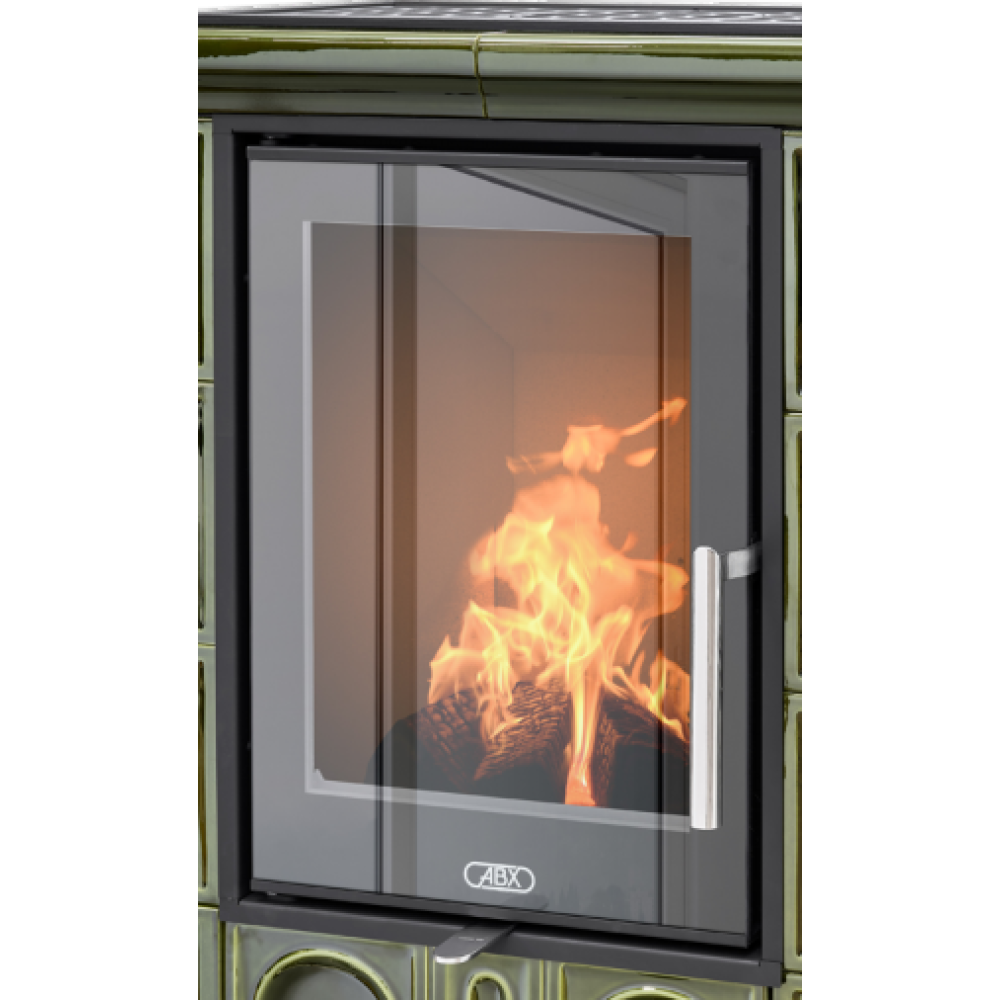 Кафельная дровяная печь ABX Britania EXclusive кафельный цоколь, зеленая в своей конструкции имеет улучшенную топку: более глубокую и продуманную, позволяющую экономно использовать топливо. Дверца топки полностью закрыта стеклом, устойчивым к высоким темературам, с шелкографией для увеличения обзора пламени.