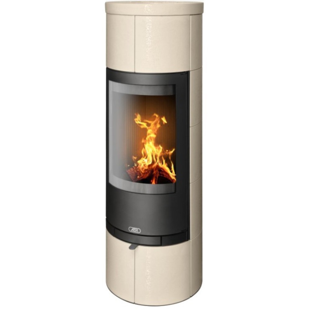 Кафельная печь ABX (ЭйБиИкс) Kastilie белый бриллиант – это высокая модель, выполненная в виде цилиндрического камина с задним дымоходом. Устройство может стать украшением комнаты, так как облицована декоративным кафелем и снабжается панорамной дверцей с огнеупорным стеклом. В печи предусмотрена технология вторичного дожига для экономии топлива.