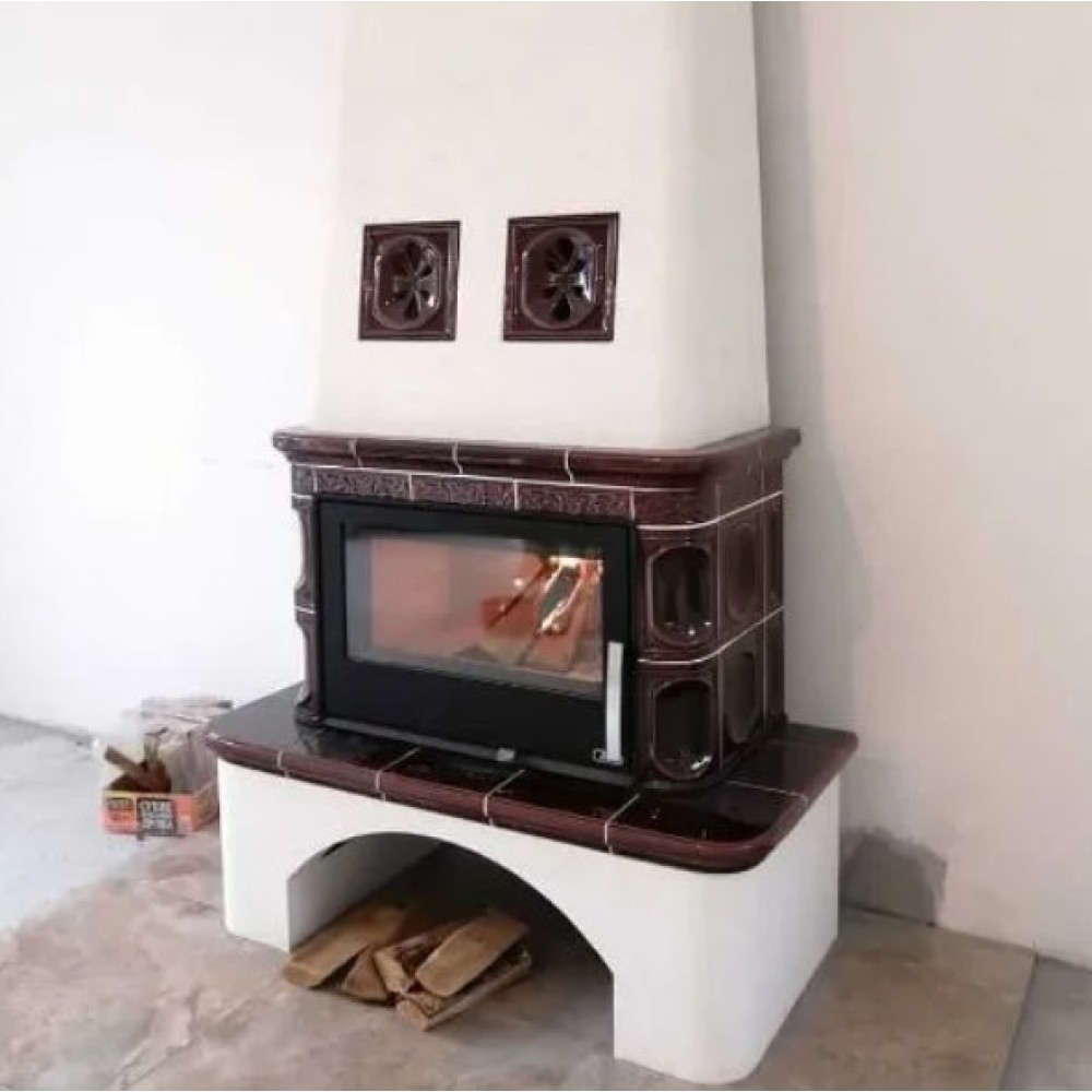 - Белый кожух камина идёт комплектом, снабжен вентиляционными решетками из кафеля для быстрого и эффективного распределения горячего воздуха по помещению.