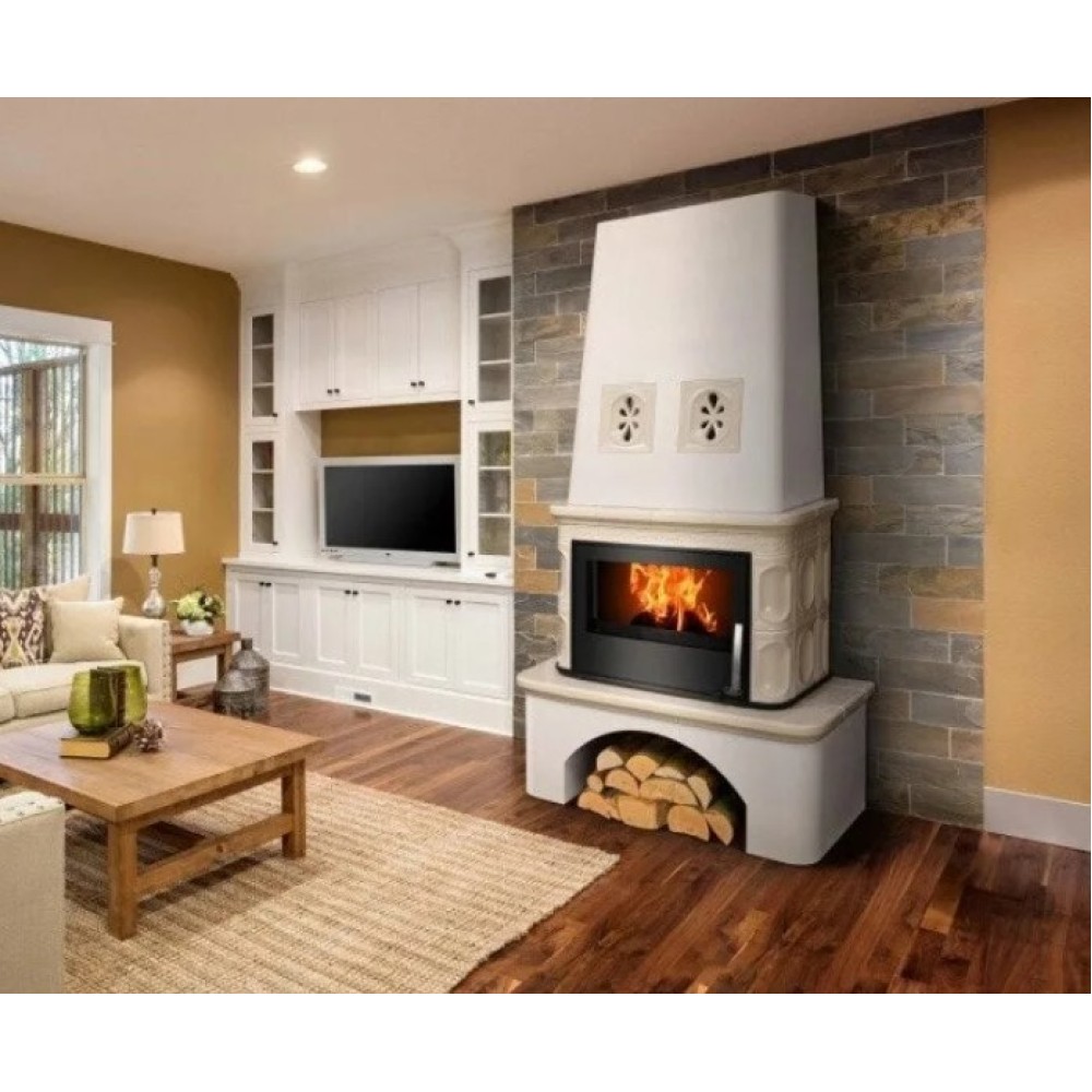 - Белый кожух камина идёт комплектом, снабжен вентиляционными решетками из кафеля для быстрого и эффективного распределения горячего воздуха по помещению.