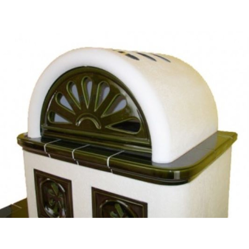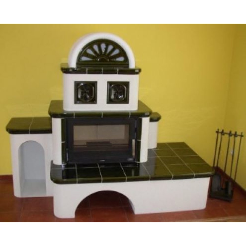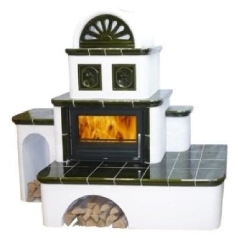 Печь ABX OXFORD левая, зеленая, довольно внушительная по своим габаритам, требует установки в не менее большом помещении для его обогрева. Поэтому печь снабжена не одной, а несколькими поленницами. Печь обладает многоярусным дизайном с полками и нишами, где можно разместить либо дрова, либо вещи. Имеются печи в зеленом и коричневом цветах керамики.