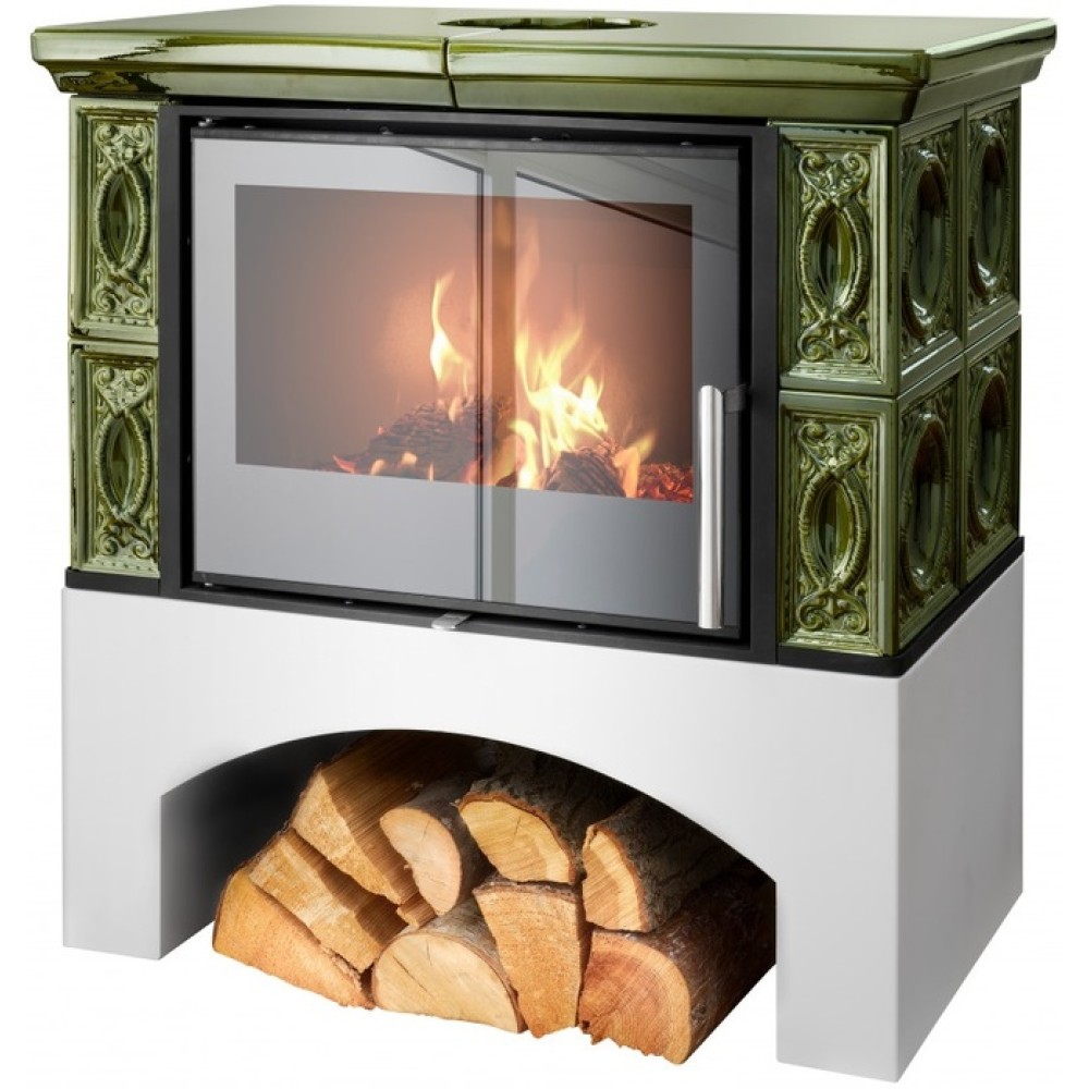 ABX Panonie EXclusive кафельная, зеленая – это дровяная изразцовая печь-камин с облицовкой из кафеля с красивым формовочным рисунком. Она имеет необычный и привлекательный внешний вид, установлена на подиум с арочной нишей для хранения дров. Печь можно подключить к забору воздуха с улицы, что позволит сохранять кислород в комнате.