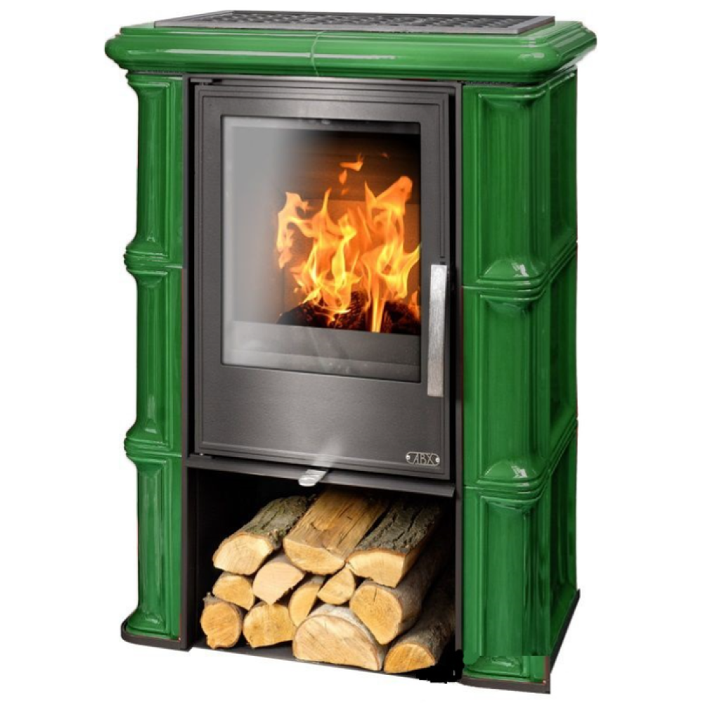 Дровяная печь-камин ABX Sicilia KI кафельная, зеленая выполнена в классическом, изящном стиле за счет наличия керамических изразцов, имеющих глянцевый блеск, благодаря покрытию глазурью. А дверца с жаропрочным стеклом открывает обзор на огонь. При этом печь достаточно эффективно обогревает большие помещения, площадью 70 м2. Для удобного хранения дров, она оснащена дровником.