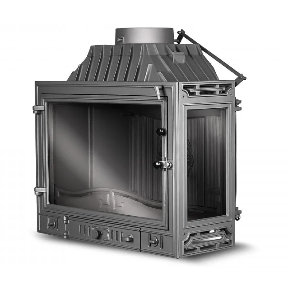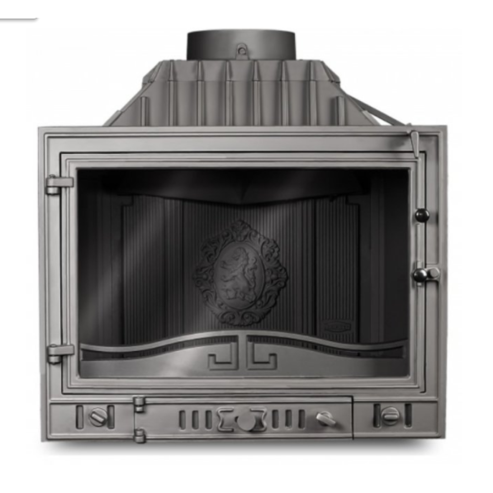 Каминная топка Kawmet W4P (правое,2 стекла) 14.5 кВт имеет дополнительное правое стекло и позволяет наслаждаться игрой живого огня. Данные отопительный предмет может стать украшением любого интерьера как дома, так и офиса. В задней части есть жаростойкая плита, которая украшения гербом со львом.
