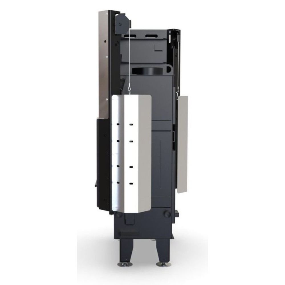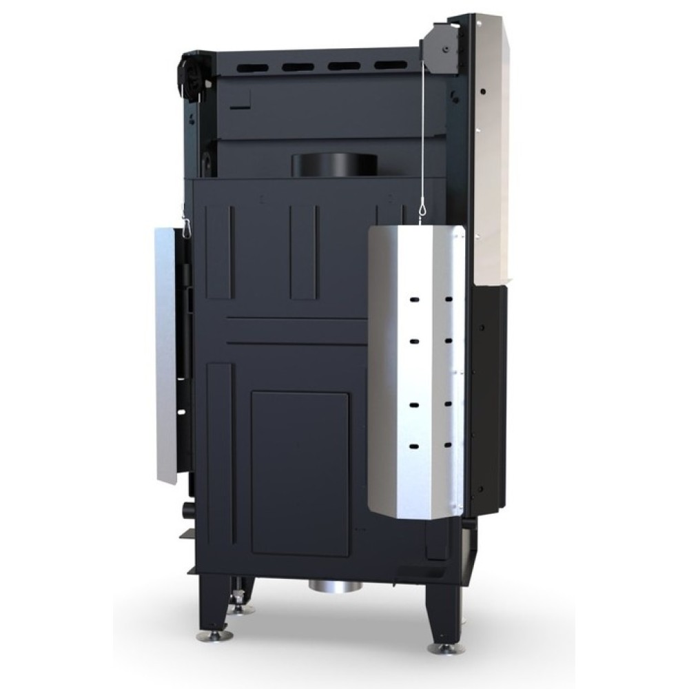 Конструкция дровяной топки DEFRO (Дефро) HOME IMPULS SM BL G выполнена в стальном корпусе, топочная камера встроена внутри и закрывается гильотинной дверцей с жаропрочным стеклом. Высокий дымосборник существенно облегчает эксплуатацию топки. В основании коробки установлена колосниковая решетка, на которой сгорают дрова.