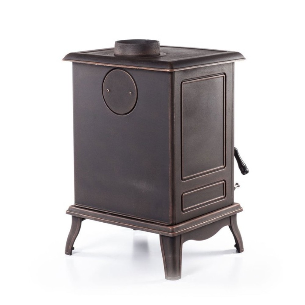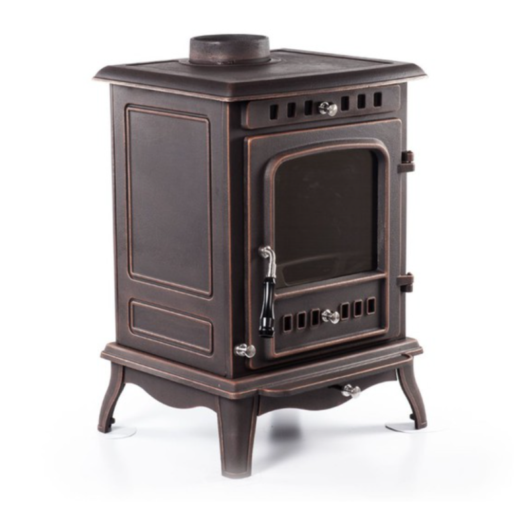 Топочная камера печи Fireway (Фаервэй) ERIK патина медь облицована двойными чугунными стенками, защищающими корпус по всей высоте. Дымоходный зуб изготовлен из чугуна, через него подается нагретый воздух. Выхлопная труба находится либо сверху, либо сзади и имеет диаметр 140 мм. Через огнеупорное стекло дверцы передаётся тепло в помещение.