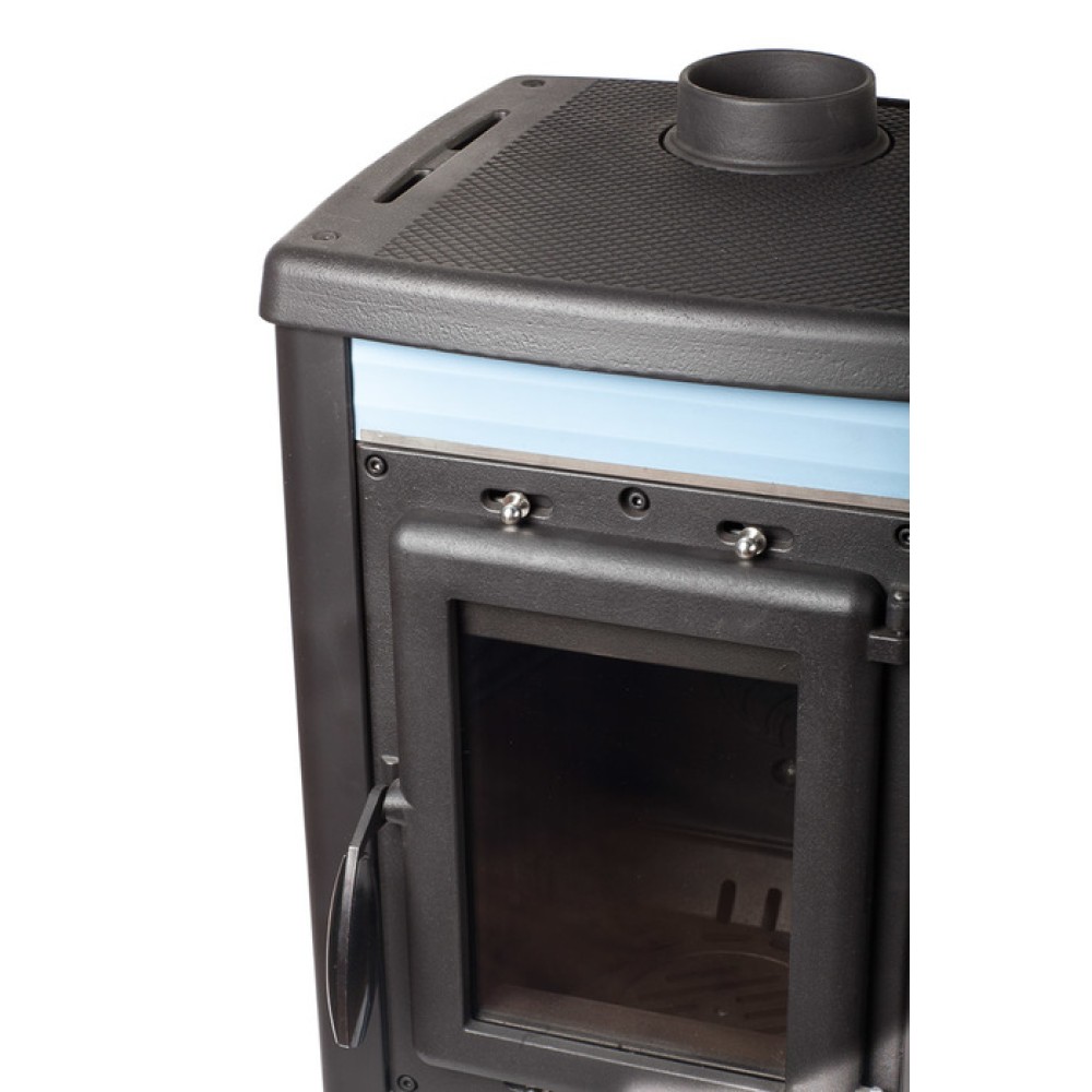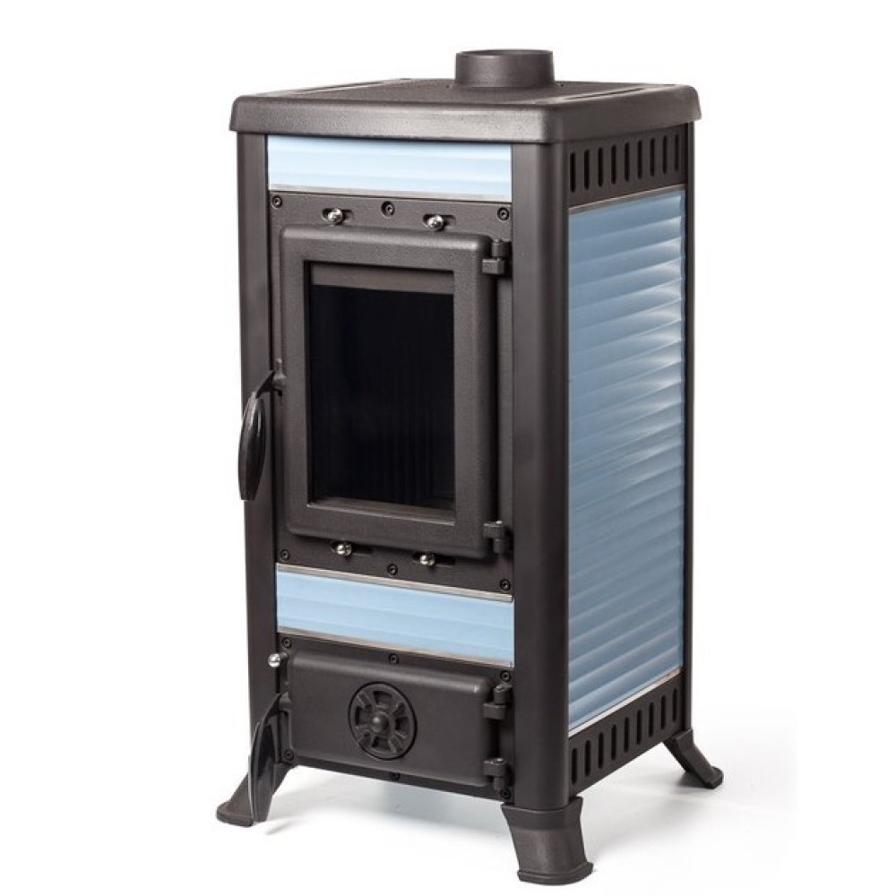 Стильная дровяная печь Fireway (Фаервэй) KLEMENS I голубой изготовлена из долговечного чугуна, боковые и передние панели облицованы рифлеными пластинами голубого цвета. В топочной дверке установлено огнеупорное термостойкое стекло, размером 22,1 на 31,3 см, сквозь которое можно любоваться процессом горения.