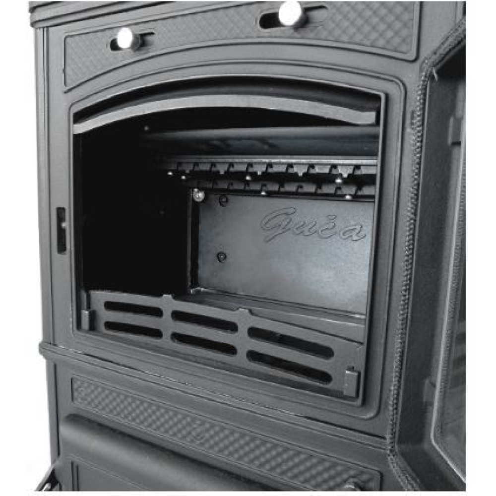 Одна из самых мощных печей бренда Gucha (Гуча) LAVA предназначена для обогрева закрытых помещений до 250 кубических метров. Топочная камера внушительных размеров позволяет использовать дрова до 40 см, а также печь оборудована вместительным зольником. Благодаря системе подачи вторичного воздуха дожигаются частички топлива, улетающие в трубу, поэтому дымоход остается чистым гораздо дольше.