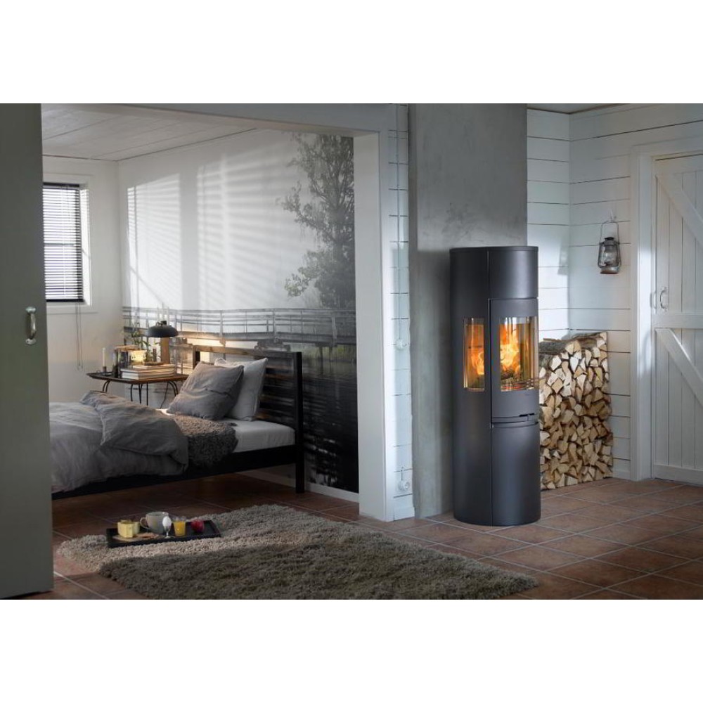 Печь-камин Contura (Контура) 596G:1 Style, стеклянная дверца, черный выпускается в цилиндрической форме и может быть установден в углу или в центре помещения. Материалом изготовления камину служит сталь, которая покрывается огнеупорной краской. Подключение к дымоходу возможно двумя способома - сверху или сзади.
