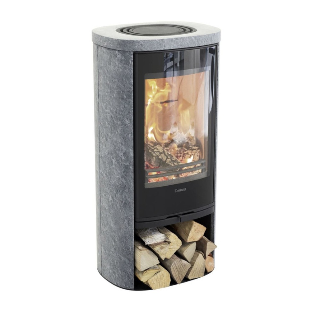 Печь Contura (Контура) 820TG Style, стеклянная дверца, черный изготавливается из панелей, состоящих из натурального камня талькомагнезита. Сама дверца состоит из жаропрочного стекла, выдерживающего до 750°С. Печь следует размещать на металлическом листе либо на закаленном стекле. При желании можно приобрести дверцу для закрытия цоколя с дровами.