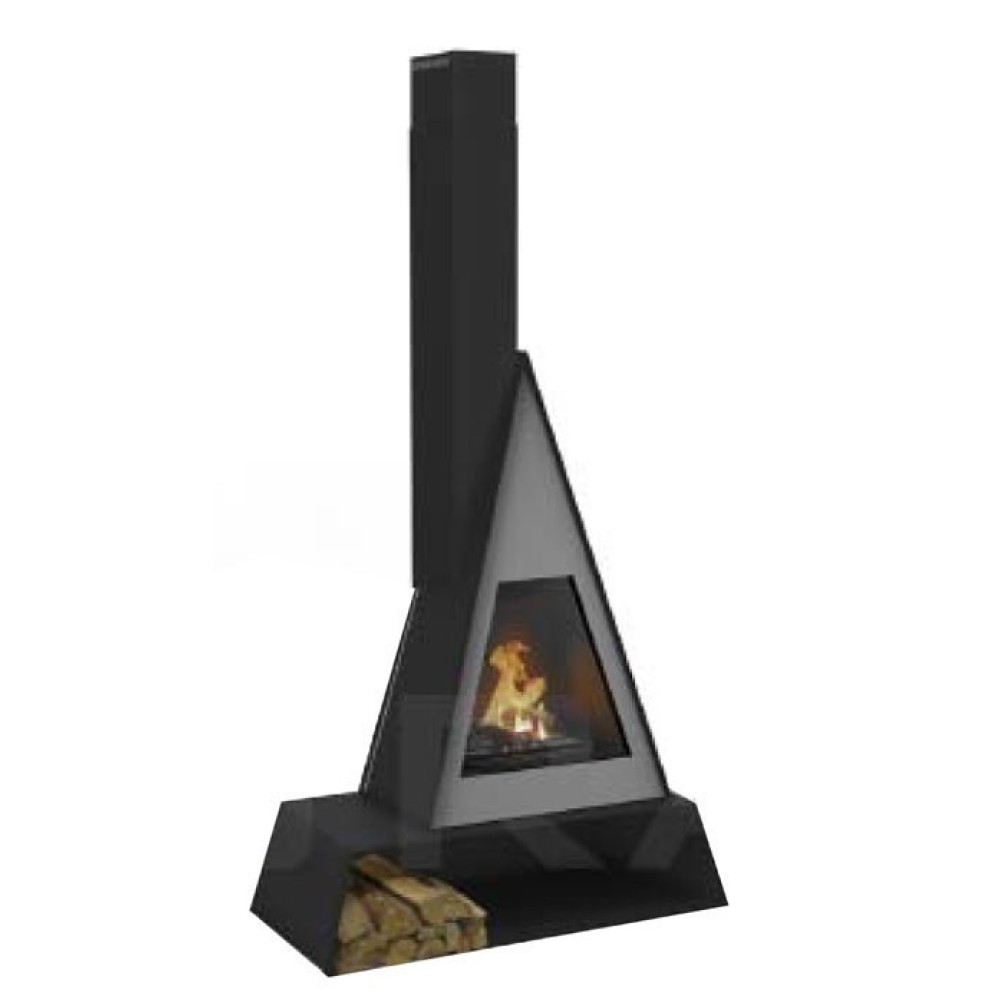- Пристенный треугольный камин с вертикальной трубой сбоку и боковой дверцей для загрузки дров