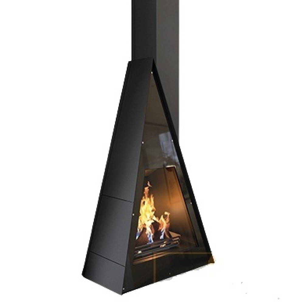 - Пристенный треугольный камин с вертикальной трубой сбоку и боковой дверцей для загрузки дров
