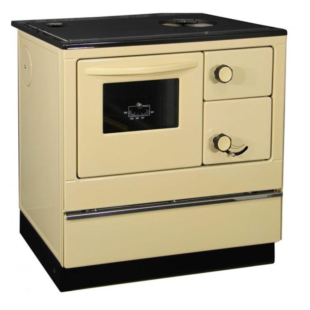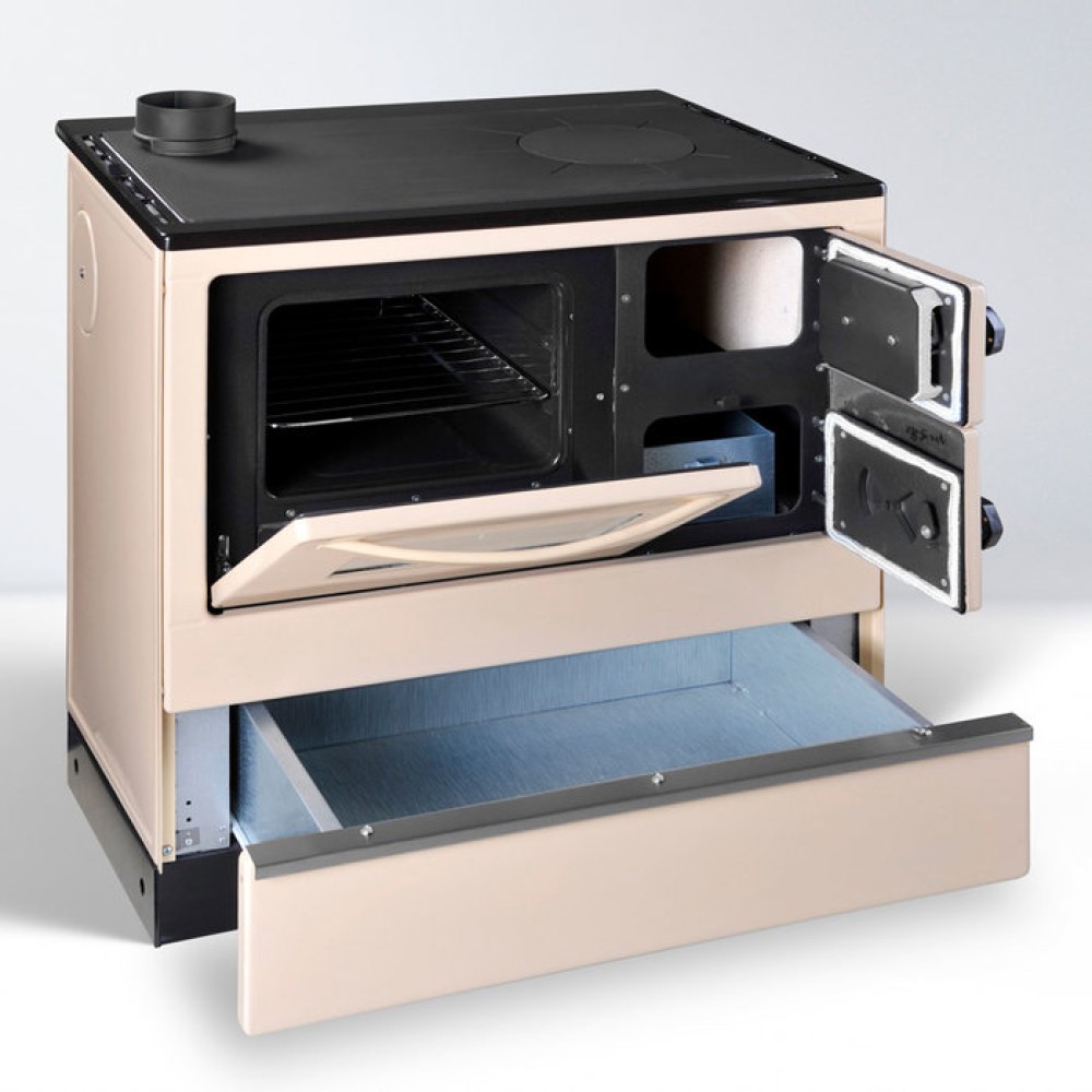 Дровяная печь THORMA (Торма) OKONOM 85/FIKO DELUXE, правая, бежевая оснащена духовым шкафом с дверцей из жаропрочного стекла и поверхностью для кипячения воды и приготовления еды. Печь изготавливается из стали и может использоваться для обогрева небольшого дома или дачи площадью 70 квадратных метров.