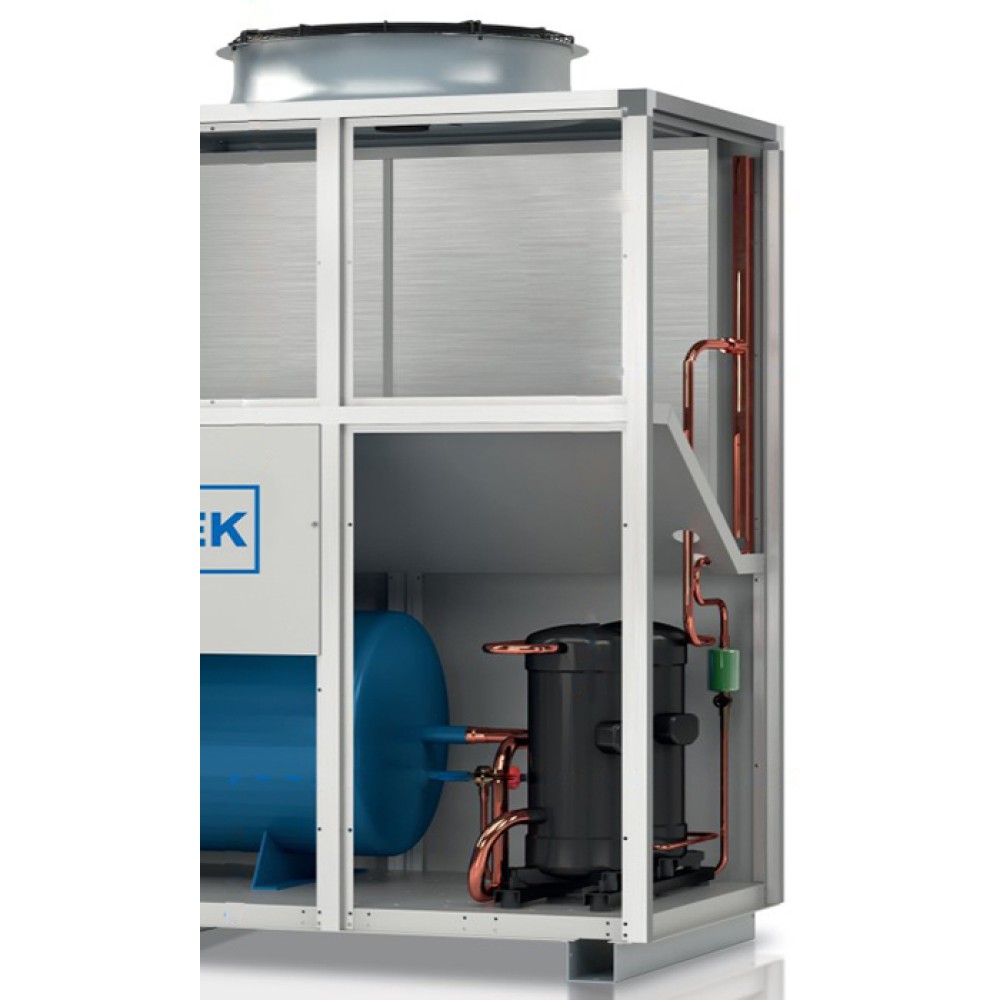 Многокомпрессорный чиллер с воздушным охлаждением Euroklimat (Евроклимат) EKCCL 613 оснащается воздушным теплообменником из медных трубок, а алюминиевое оребрение позволяет значительно увеличить площадь. Оборудование может объединить работу нескольких фанкойлов и кондиционеров разного уровня и мощности.