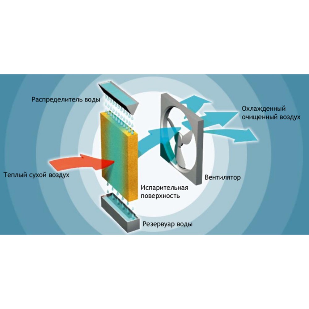 - Охлаждение воздуха осуществляется за счет испарения влаги