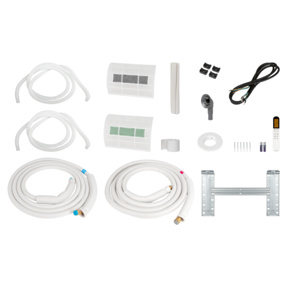 - Комплект поставки: линия охлаждения 5 м, кабель питания 1,5 м, инфракрасный многофункциональный пульт дистанционного управления, виниловая лента, крышка отверстия, шланг для конденсата, крепежный материал (внутренний блок)