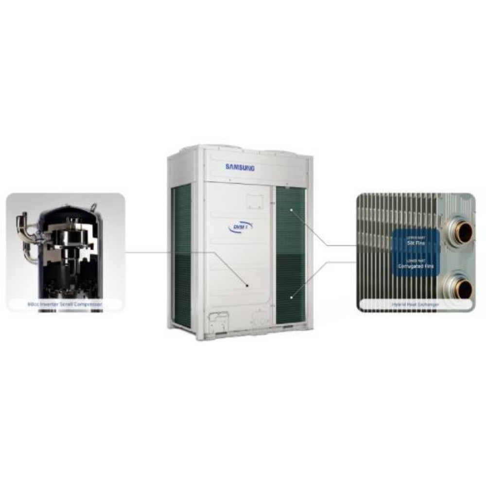 Наружный блок мультизональной системы DVM S, тепловой насос Samsung (Самсунг) AM300KXVAGH/TK стал еще более компактным при увеличенной производительности. Блок производительностью 84 кВт занимает всего 0,99 кв. м площади при весе 350 кг. Производительность в режиме охлаждения одной системы кондиционирования в комбинации из четырех блоков достигает 336 кВт.