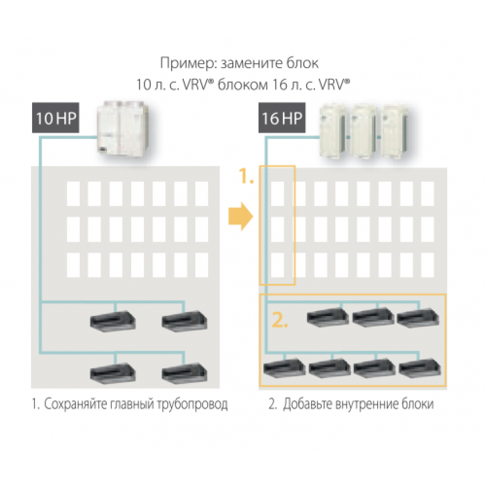 Наружные блоки серии RXYQQ используются для организации мультизональной сплит-системы с применением эффективного хладагента R410A. Примененная инверторная технология гарантирует стабильность действия и высокую производительность оборудования. Устройства линейки характеризуются большой протяженностью трасс трубопроводов, малым расходом электроэнергии и простотой монтажных работ. Также с помощью климатических установок можно модернизировать существующие VRV системы.