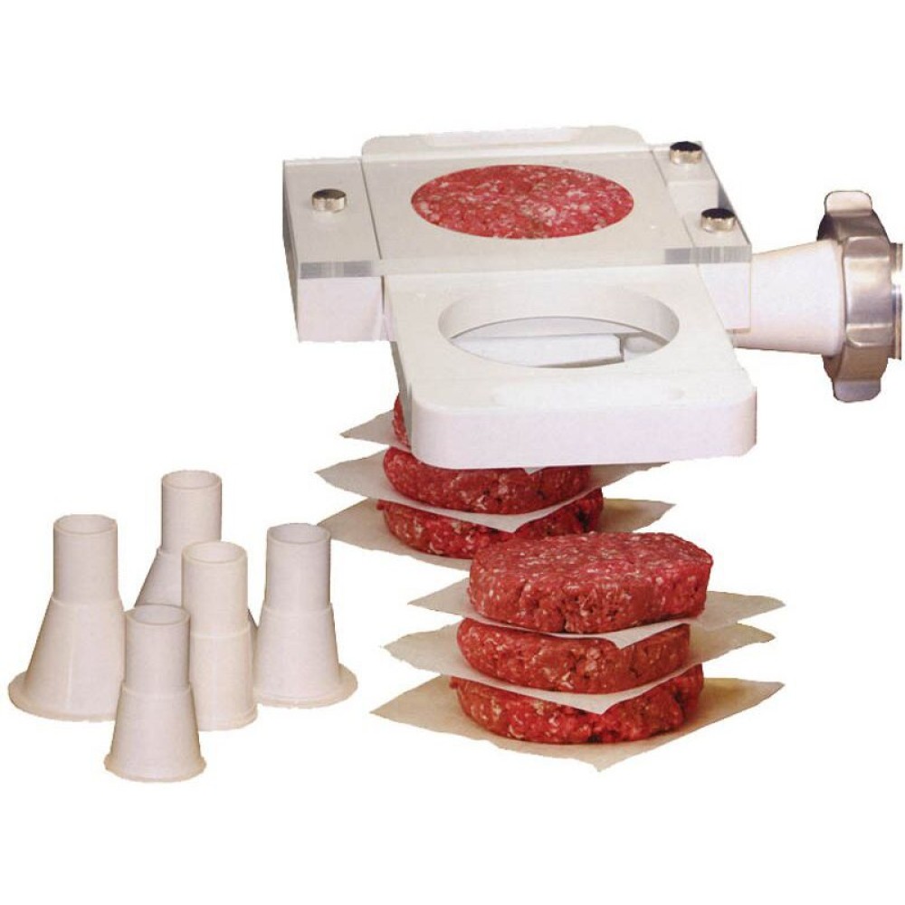 Насадки для колбасного щприца"Гамбургер пресс" предназначены для изготовления начинки для гамбургеров диаметром 100 Изготовление начинки происходит со скоростью подачи фарша из мясорубки или шприца, до 20 штук в минуту. Пластиковый и акриловый пресс образует начинку толщиной 19мм, весом 150г под давлением подачи фарша, готовые формы извлекаются путем передвижения лотка.