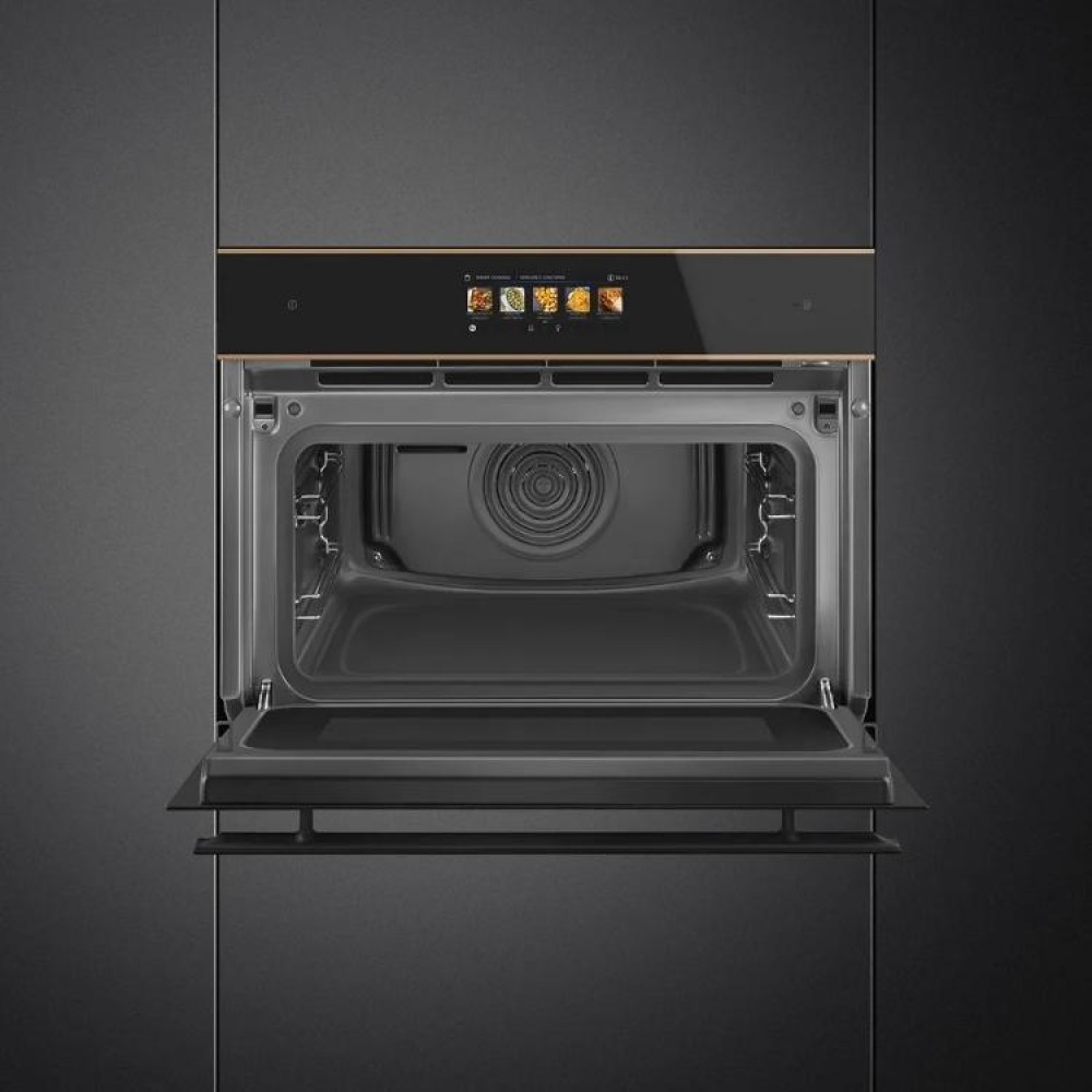 Количество режимов работы в духовом шкафу Смег: 26. В число доступных программ входят: классический нагрев, нижний нагрев, конвекция, приготовление с помощью микроволн, дополнительное использование пара, гриль для создания хрустящей корочки, пицца, и другие. Помимо основных программ воспользуйтесь специальными возможностями этого прибора: режимом Sous-Vide для приготовления нежных, диетических блюд в вакуумной упаковке; вентилятором, совмещенным с грилем; и другими.
