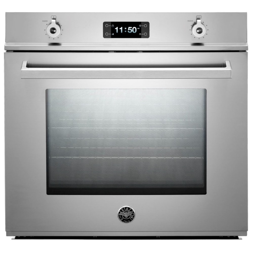 Духовой шкаф Bertazzoni F30PROXT — независимая встраиваемая модель увеличенных габаритов, которая отличается особенно большим объемом камеры 116 литров. Выполнена в универсальном дизайне и цвете нержавеющей стали, который подойдет для интерьеров в классическом и современном стиле. На панели управления располагаются два поворотных переключателя для установки режима работы и сенсорный дисплей с таймером и электронными часами. Откидная дверца оснащена съемным четырехслойным стеклом. Модель позволяет готовить на 7 уровнях, противни легко выдвигаются на металлических направляющих, в том числе телескопических. 11 режимов работы предусматривают приготовление на гриле, при помощи конвекции и кольцевого нагревательного элемента, турбо-режим, выпечку, высушивание, размораживание, пиролитическую очистку.