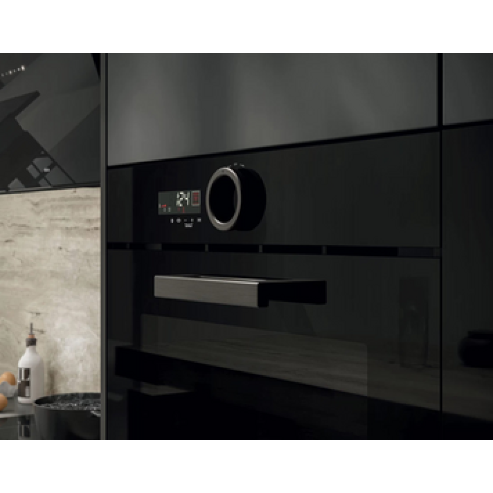 Энергоэффективность даже при высоких температурах. Линейная эстетика черного цвета элегантно вписывается в любой "кухонный контекст". Отличительный элемент: регулятор в форме диска в центре стеклянной панели, который напоминает ручку и сопровождает цифровой дисплей с интуитивным интерфейсом. Благодаря точному управлению нагревом традиционные режимы, такие как: "Статический", "Вентилированный", "Гриль" и "Интенсивный" становятся более эффективными даже при максимальной мощности и температуре в 300°C. Высокая температура позволяет готовить пиццу с минимальными затратами времени, а стабильность нагрева — получать блюда равномерно прожаренные внутри и снаружи. Рабочие характеристики обеспечиваются специальными износостойкими материалами и отменной изоляцией. А как же очищается духовка? Очень просто! Специальный цикл, немного воды и несколько капель моющего средства.