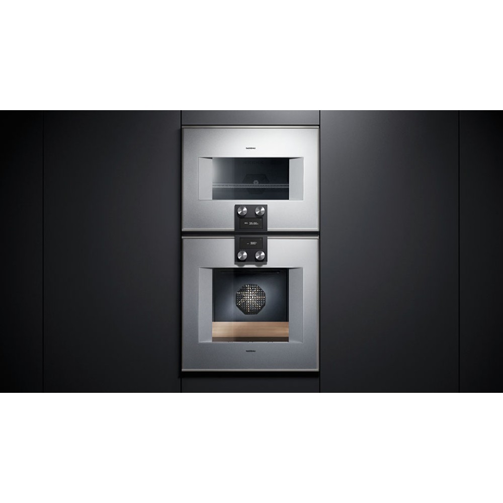 Духовой шкаф Gaggenau работает в 13 режимах нагрева. Камера легко очищается с помощью пиролиза и каталитического фильтра для воздуха. В комплекте: эмалированный противень, стеклянная сковорода, термощуп с функцией отключения, решетка для гриля, четырехуровневые направляющие.